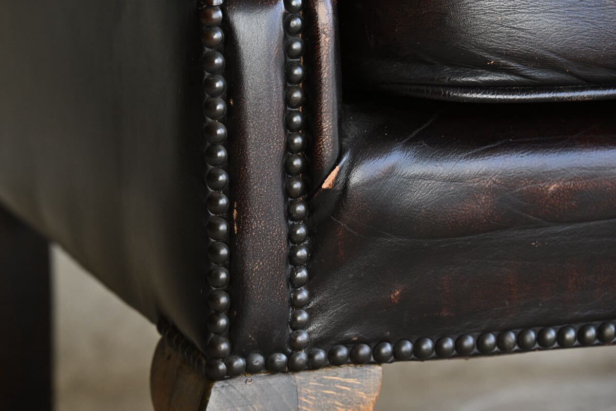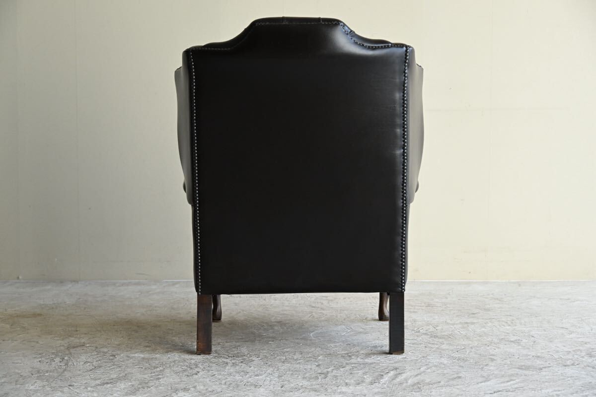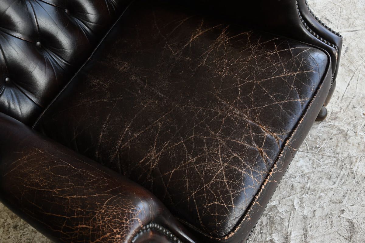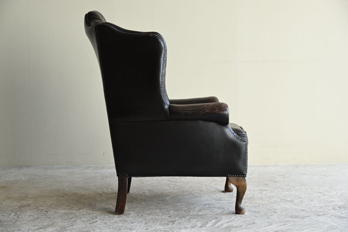 ヴィクトリアン・スタイル ウィングバックチェア 《ヴィクトリアン・スタイル ウィングバックチェア — 鋲打ち革張りの静謐》A Study in Leather, Silence, and Time19世紀英国に端を発する“ウィングバックチェア”は、かつて暖炉の側に置かれ、貴族や学者の読書と沈思の場を支えた椅子です。本作は、その伝統を色濃く受け継ぐ逸品であり、現代においてなお孤高の存在感を放ちます。 張地には、上質なフルグレインレザーを用い、時の経過とともに自然に浮かび上がったクラック(皺)や色褪せが、人工では再現し得ない真のパティーナを形成。触れるたびに、時代の手触りを伝えてくれます。 背面には、英国チェスターフィールド様式を象徴するディープボタン・タフティング。ボタン締めにより生まれる規則正しい陰影が、荘厳で格式ある印象を与え、椅子でありながら彫刻のような立体感を生み出しています。 アーム部から脚部にかけては、熟練の鋲打ち職人による装飾が施され、フレームはカブリオールレッグ(猫脚)を採用。これは18世紀のフランス・ロココ様式からインスピレーションを得たものであり、力強さと優美さを兼ね備えたシルエットが特徴です。 背面に至るまで一切の妥協なく仕上げられたレザーは、空間に置かれることで静かな緊張感を生み出し、その場の「格」を一段階引き上げる力を有します。椅子としての機能性を超えた、空間の重心としての存在。 【仕様概要】
