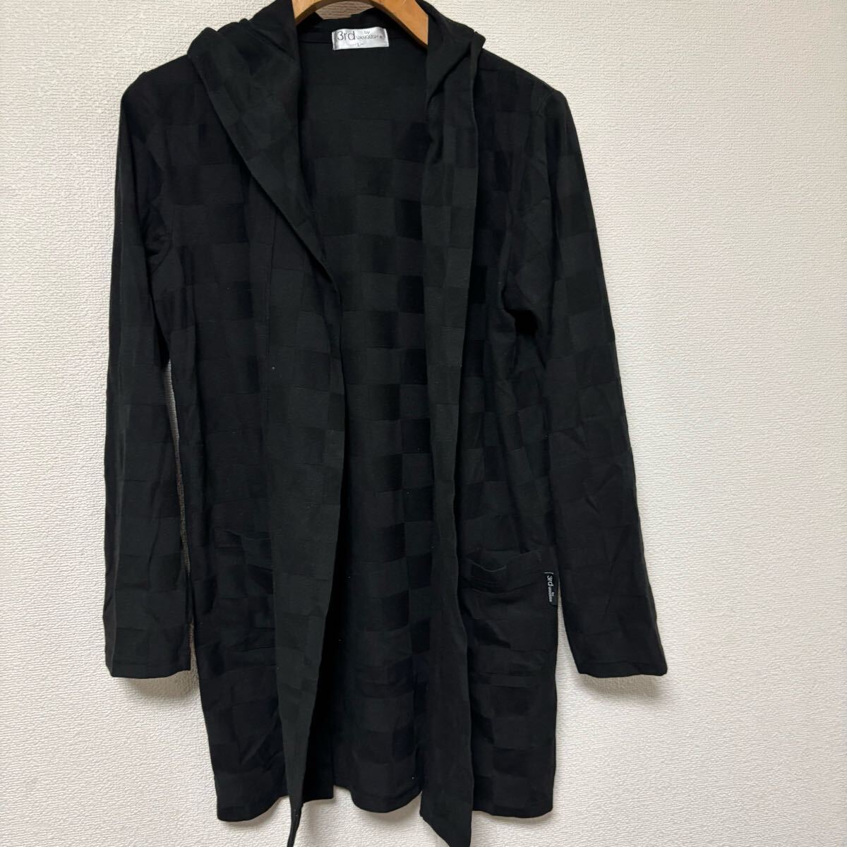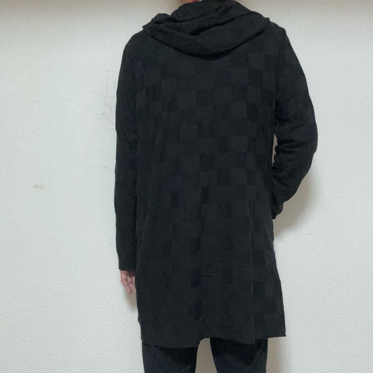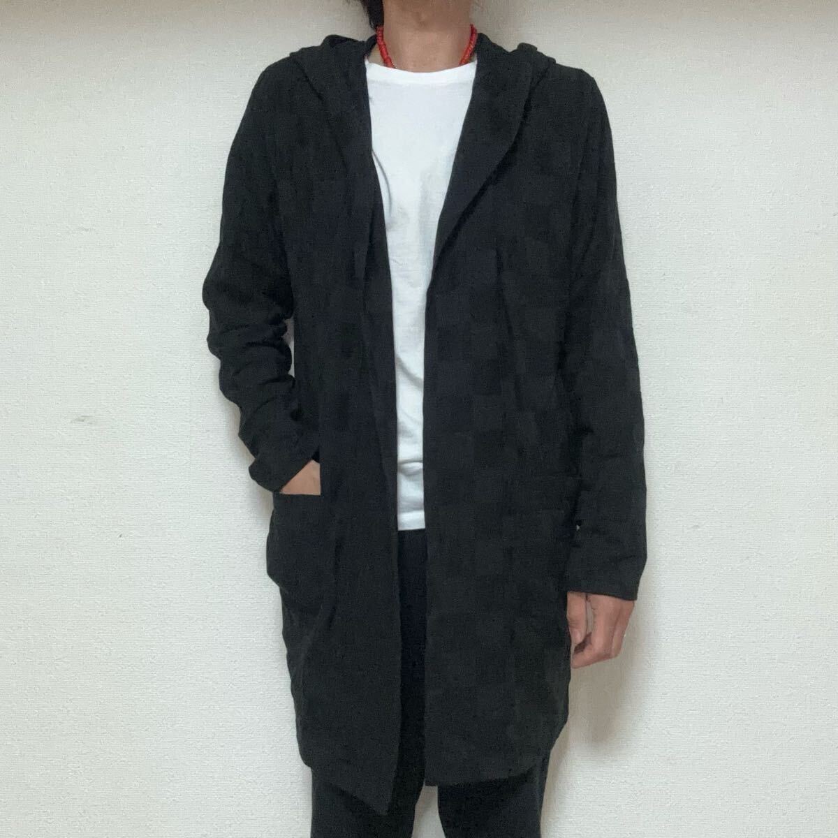 ロング丈のフーディーでフロントはオープンでガウンの雰囲気がありチェックの織り柄があり表情がありクールな一枚です。