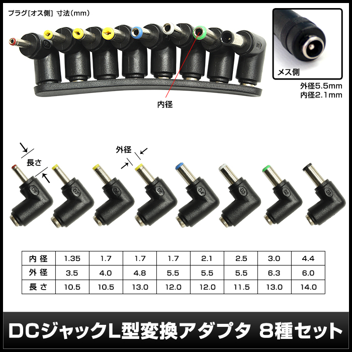 | DCジャック(メス側):外径5.5mm/内径2.1mm DCプラグ(オス側):8種類 ・外径3.5mm/内径:1.35mm/長さ:10.5mm ・外径4.0mm/内径:1.7mm/長さ:10.5mm ・外径4.8mm/内径:1.7mm/長さ:13.0mm ・外径5.5mm/内径:1.7mm/長さ:12.0mm ・外径5.5mm/内径:2.1mm/長さ:12.0mm ・外径5.5mm/内径:2.5mm/長さ:11.5mm ・外径6.3mm/内径:3.0mm/長さ:13.0mm ・外径6.0mm/内径:4.4mm/長さ:14.0mm タイプ:8種類 DCプラグ(オス側)のプラグサイズ変更可能なL型8種セットです。 | |