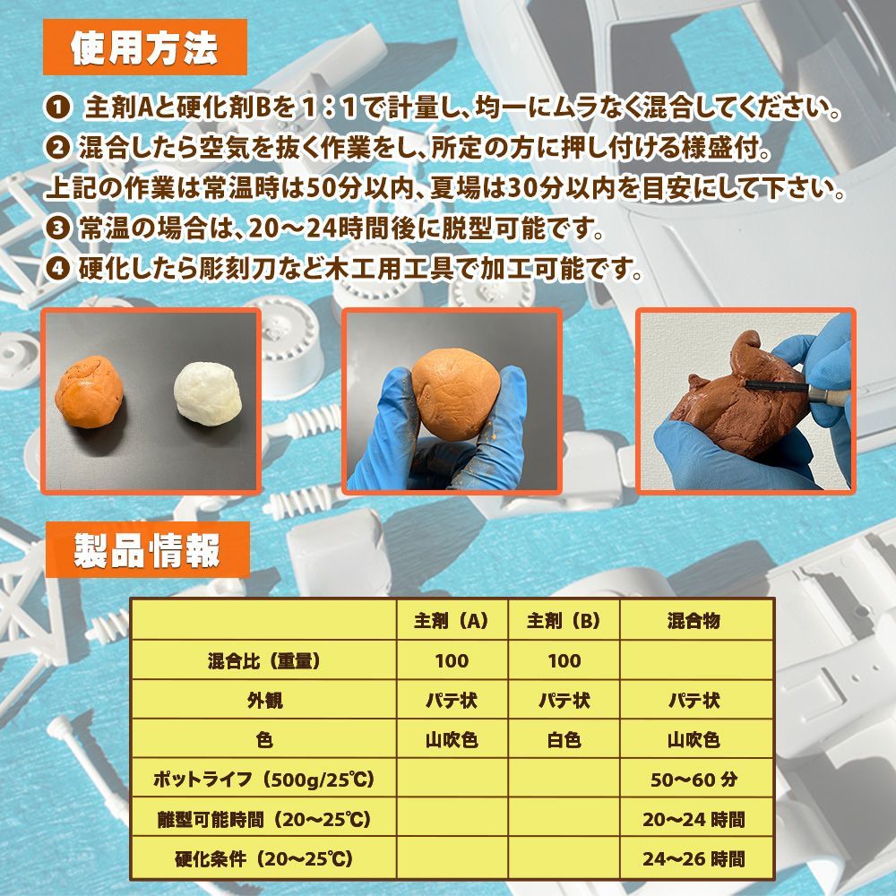 ●主剤Aと硬化剤Bを混ぜるだけで硬化するエポキシパテです。