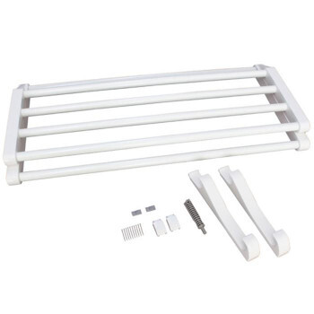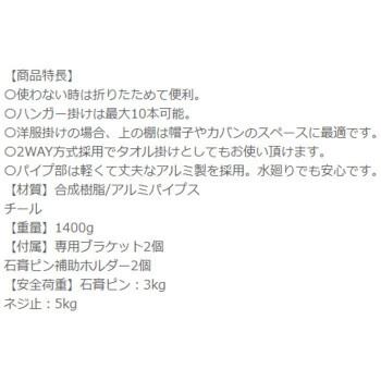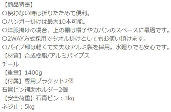 | 使わない時は折りたためて便利です。ハンガー掛けは最大10本可能です。洋服掛けの場合、上の棚は帽子やカバンのスペースに最適です。2WAY方式採用でタオル掛けとしてもお使い頂けます。パイプ部は軽くて丈夫なアルミ製を採用。水廻りでも安心です。 |