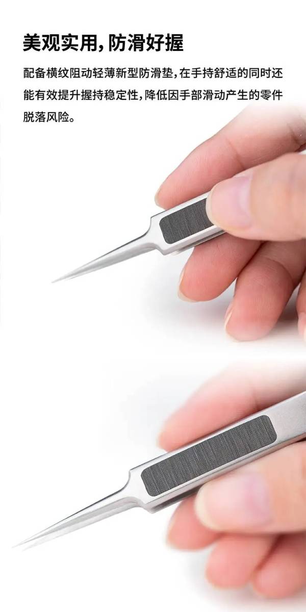 本体は耐食性、耐酸性に優れたHRC45以上の高硬度、非磁性で非常に耐久性のある高品質のステンレス鋼。硬いだけでなく弾性もあり変形し難いです。つまみ荷重(ピンセットの先端を閉じるのに必要な荷重)は約150gと軽く、精密作業でも指先が疲れることがありません。