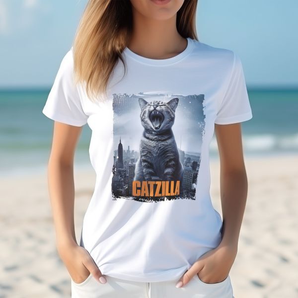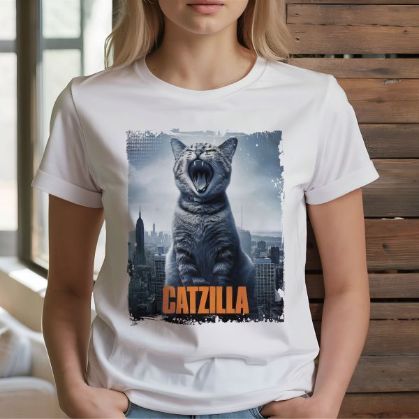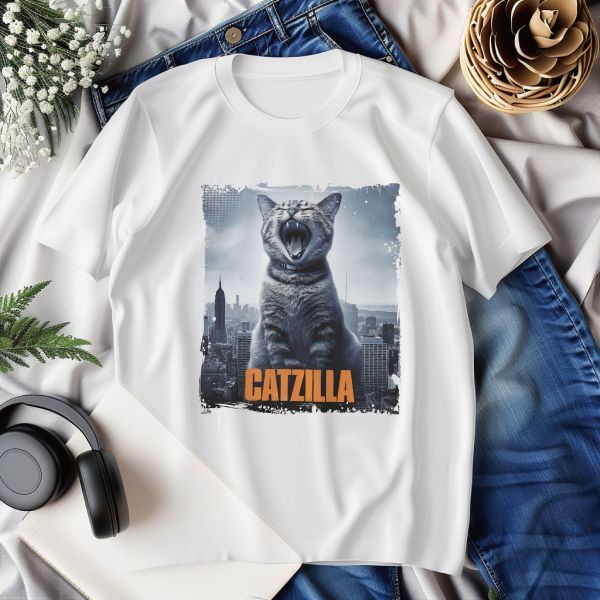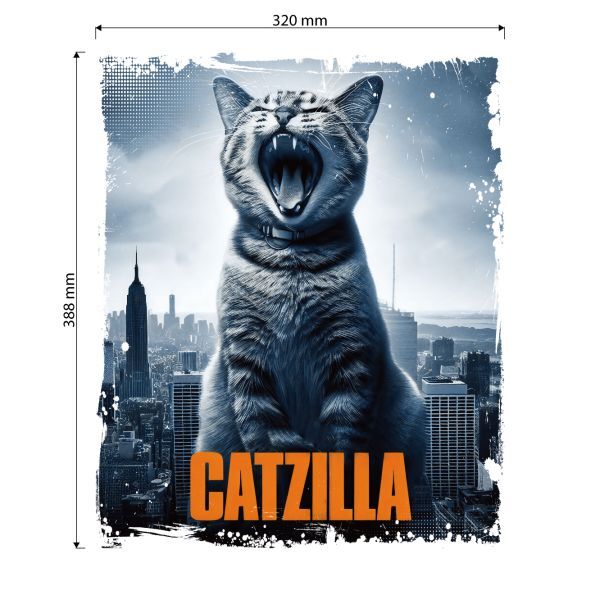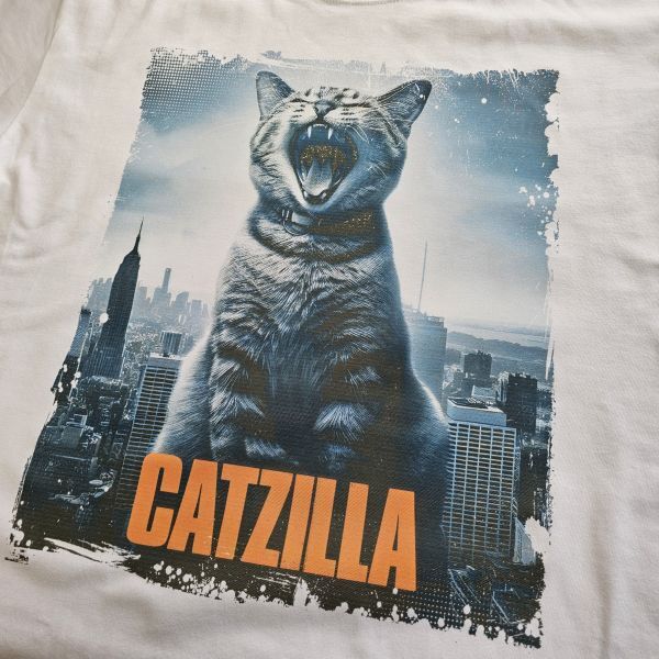 ゴジラを思わせる巨大な怪獣猫が大胆にプリントされ、見る人の視線を釘付けにします。