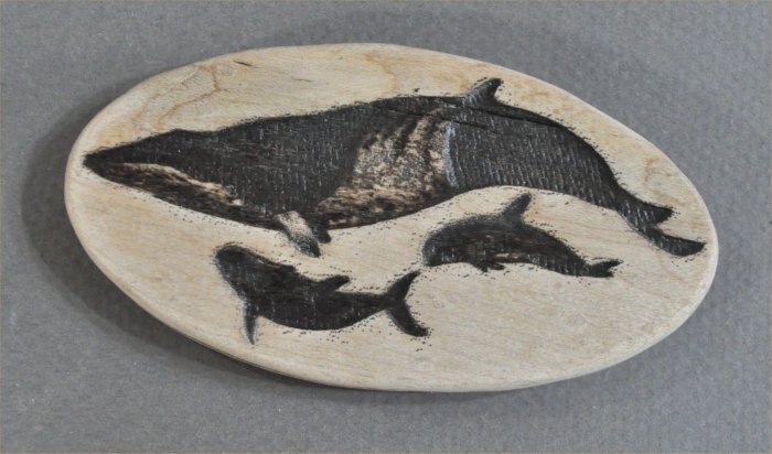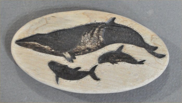 オーバルベースにレーザー彫でクジラとイルカの仲良く泳ぐ姿のベースサイズは、94mm×50mm厚み9,5mm素材、メイプルリアルなクジラとイルカのデザインの素敵なベースです。