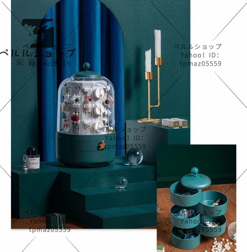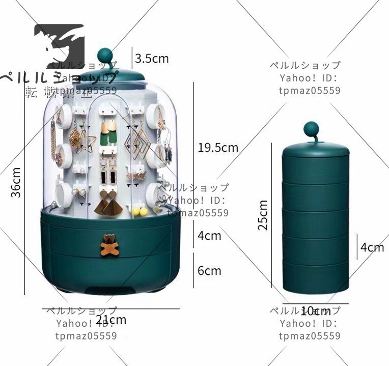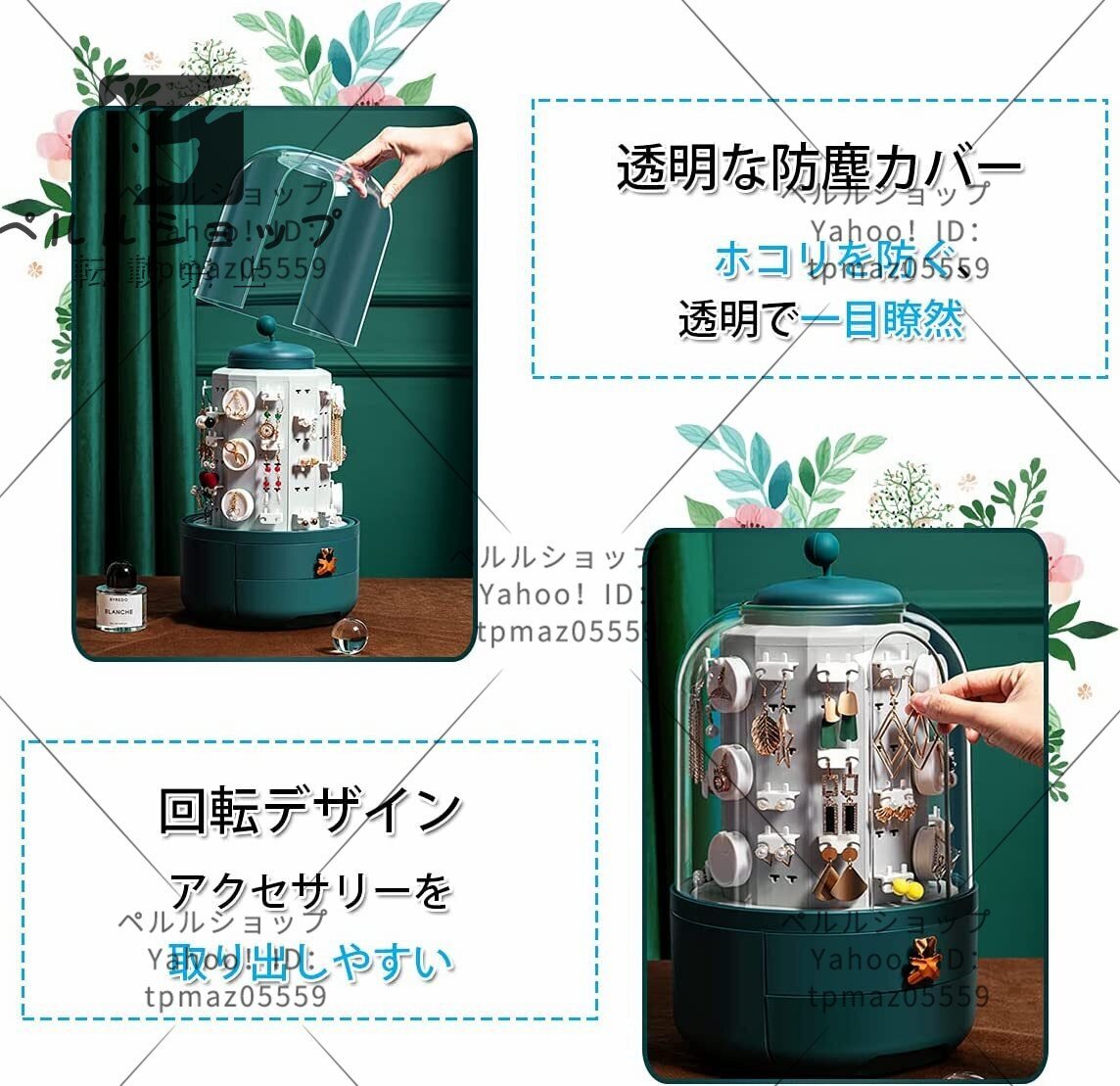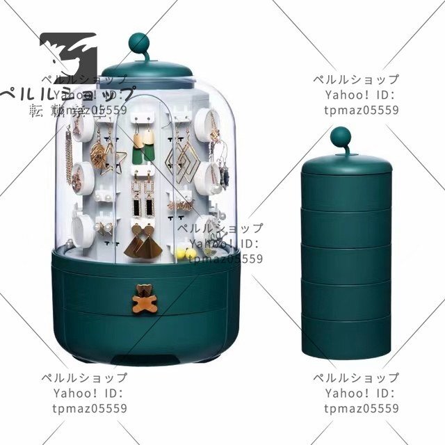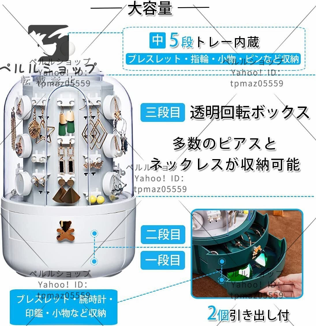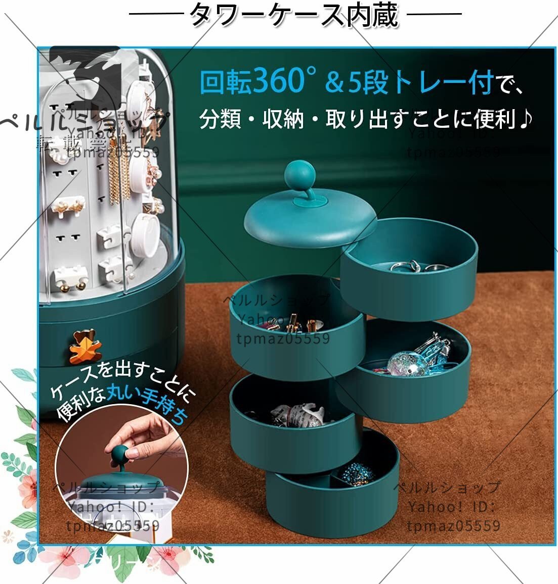【取り出しやすい回転タイプ&透明カバー】透明カバーでホコリからアクセサリーが守れる上、どこに何があるか一目瞭然、また、回転タイプなので、探しているアクセサリーがすぐに見つけられ取り出せる。時間の節約に役に立ちます。【360度回転の5段トレー内蔵】5段トレー内蔵