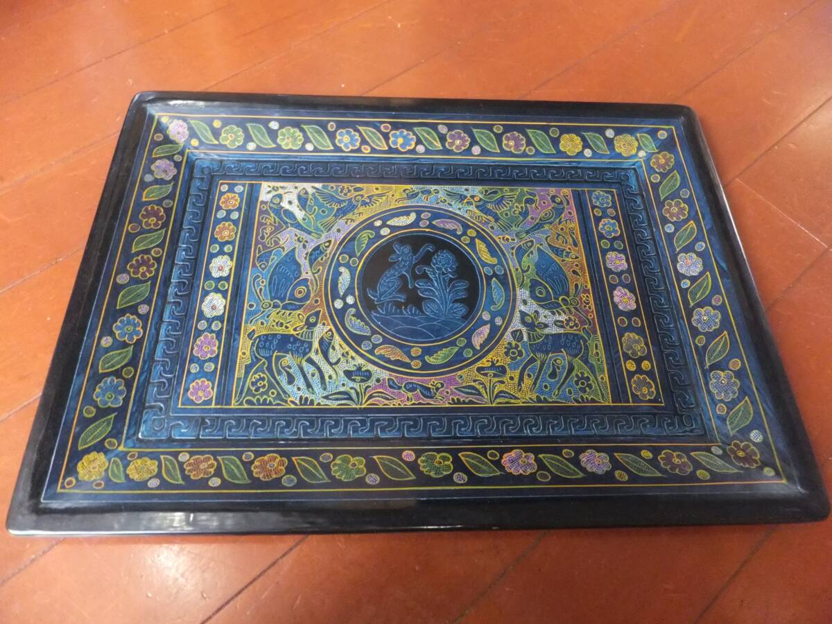 綺麗な飾り盆です。サイズは、40.4×28cm位です。飾っていました。使用品ですので神経質な方は御遠慮下さいね。ノークレームノーリターンでお願い致します。その他いろいろ出品していますので見て下さいね。