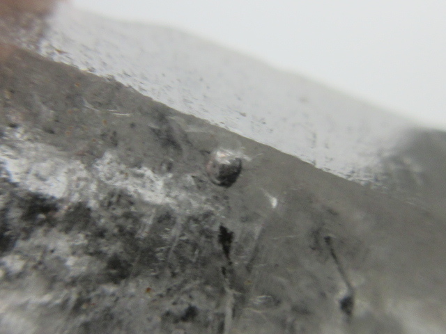 ・珍しい、水晶を返すと「V字型」に泡が浮きながら移動する太古の水入り空間のある水晶。 水晶内部にスプレー状黒色鉱物内包が見られます。そして表面には幾重にも重なるグロースクレーター、まるでジルコニアをはめたような六角形の水晶貫入が見られます。