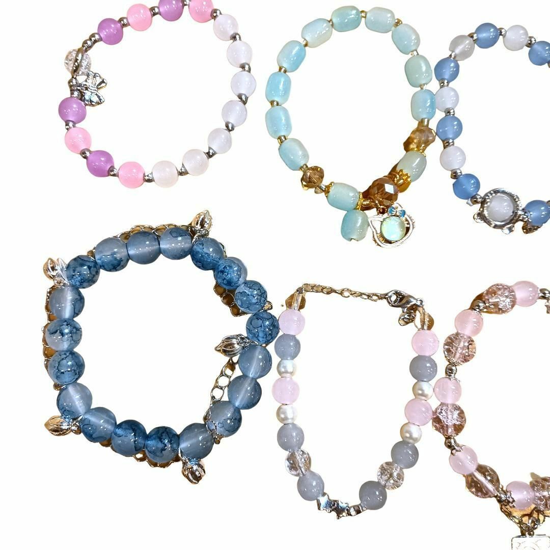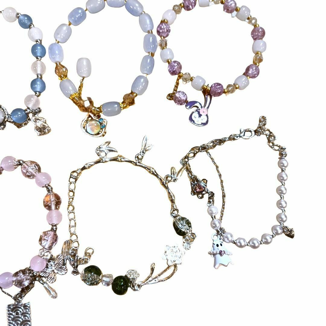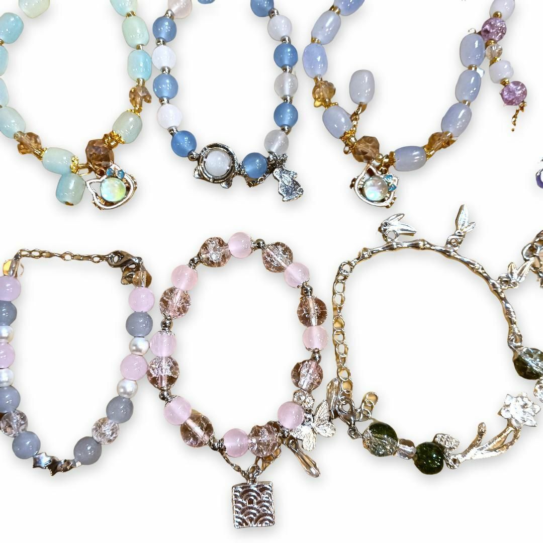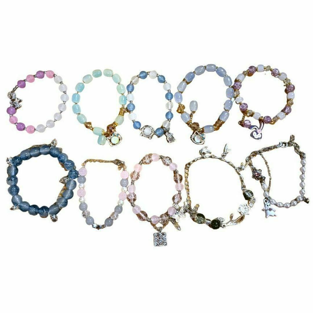 多彩なガラスビーズとチャームが特徴の10本セットブレスレット。