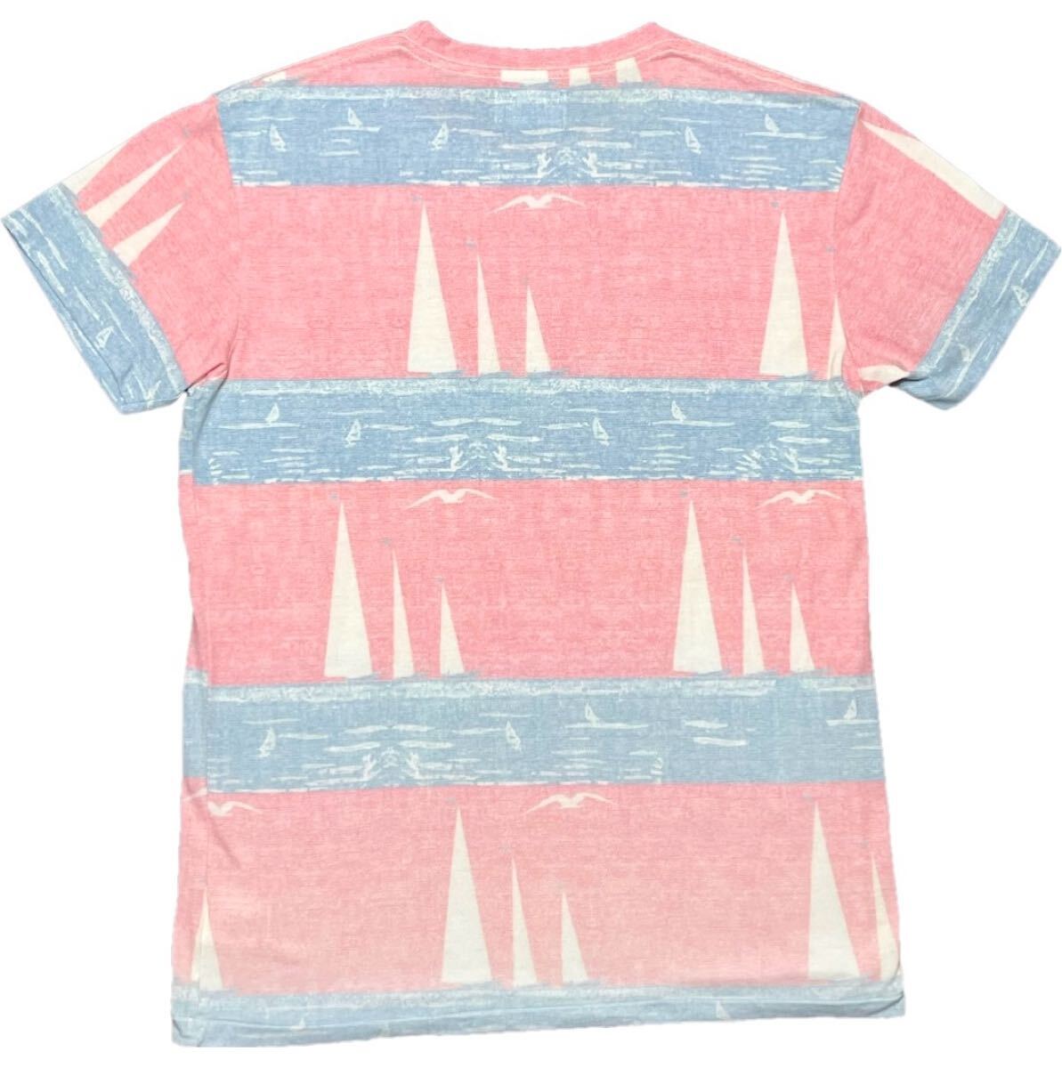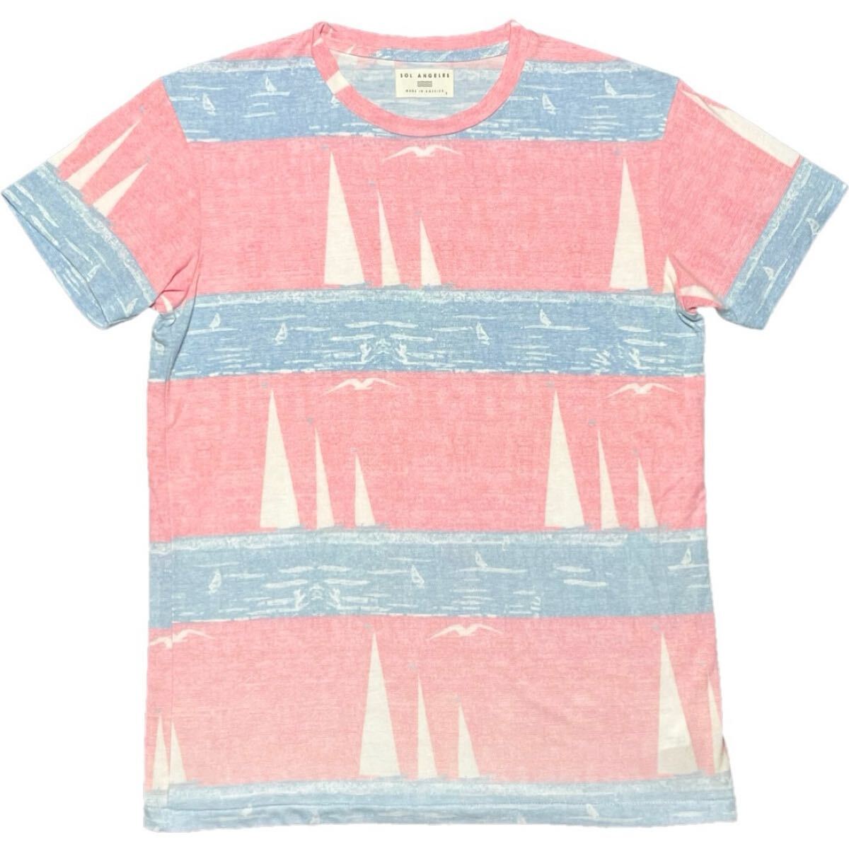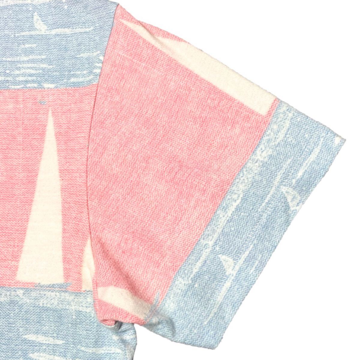 海の上にセールを広げたヨットがいるようなデザインに、太陽の光と海を表しているカラーリングで、レーヨン混素材なので肌さわりが良く着心地がとても良いオシャレなおすすめの一品です。