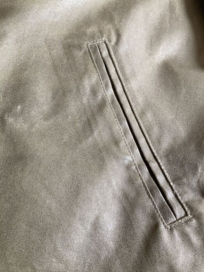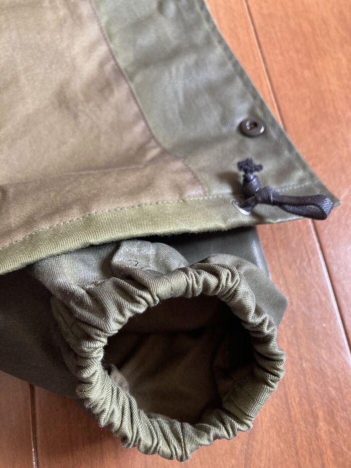 内ポケット付き。蝋引き素材を使用した裾のドローコード。脇には通気をよくする為のベンチレーションハトメ。