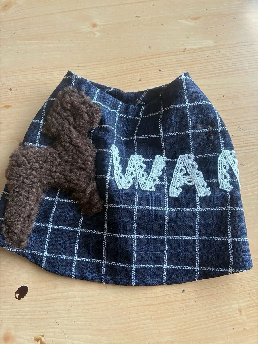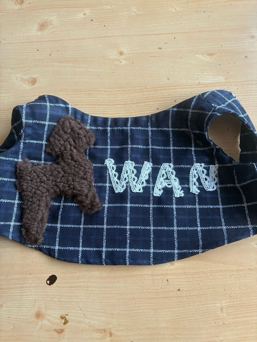 トイプードルのシルエットを背中に付けWANの文字を横にレーステープで付けました。