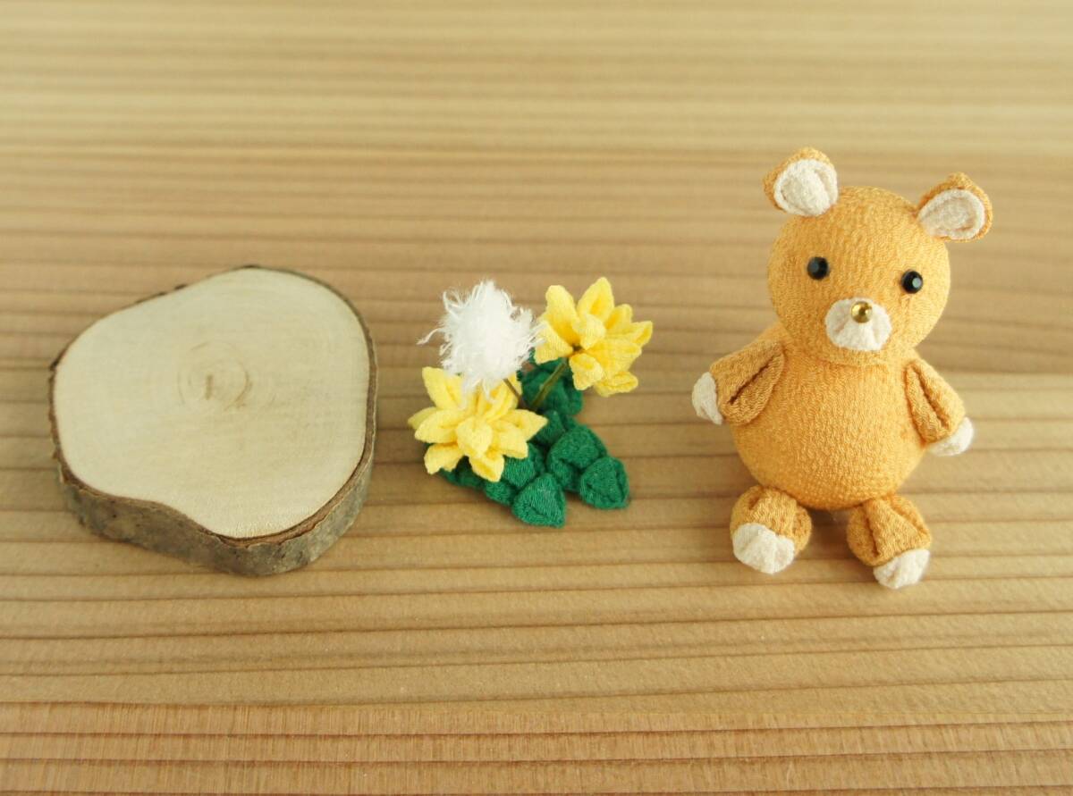♪ ハンドメイド ちりめん細工 つまみ細工 くま たんぽぽ 切り株 一越ちりめん