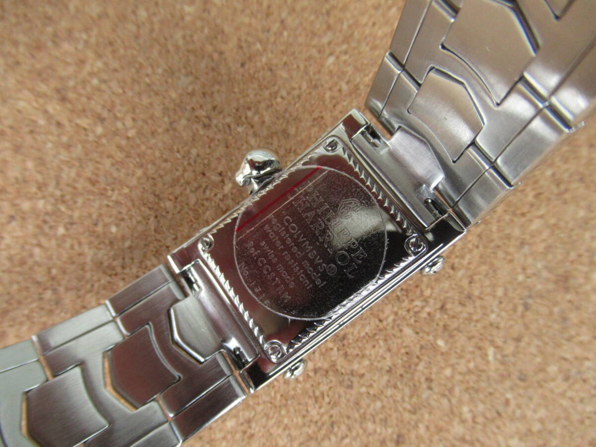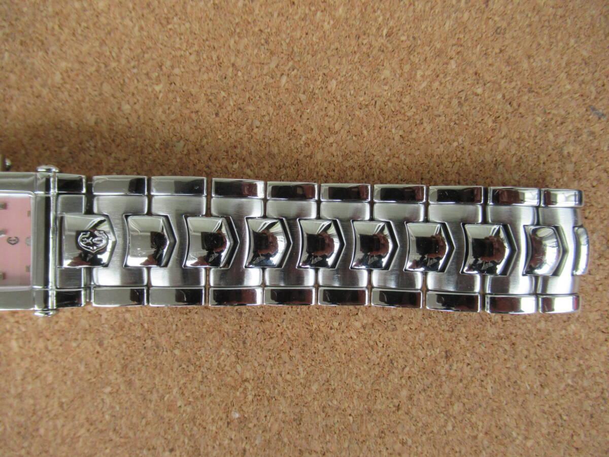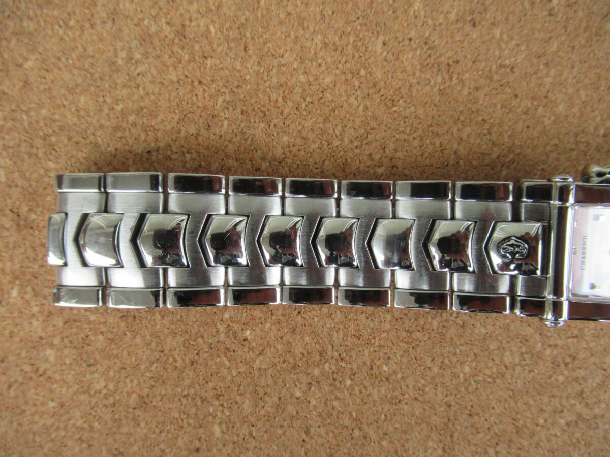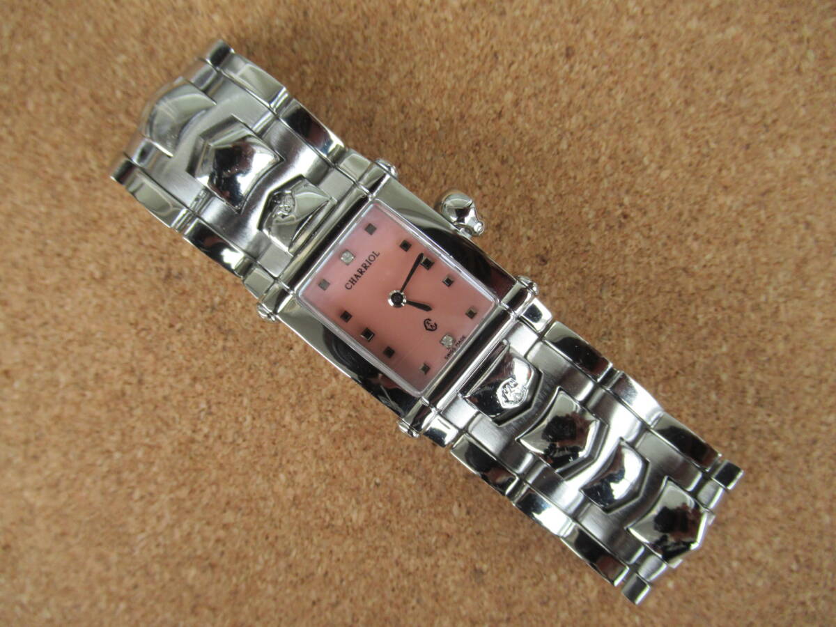 フィリップシャリオールのコロンブス《Ref.CCSTRM》レディースモデルです!! 2Pダイヤ入りピンクシェル文字盤がインパクトある時計です!! 通常のレディースより一回り大きく、幅広のブレスレットが付いた珍しいモデルです。 ケース幅は約23ミリ、腕周りは測定具計測で約16.5センチでコマを外す事で短く出来ます。