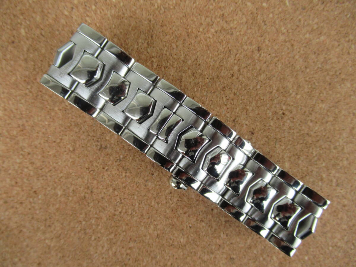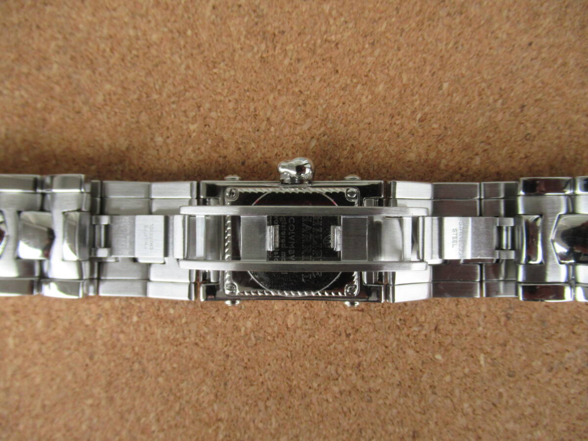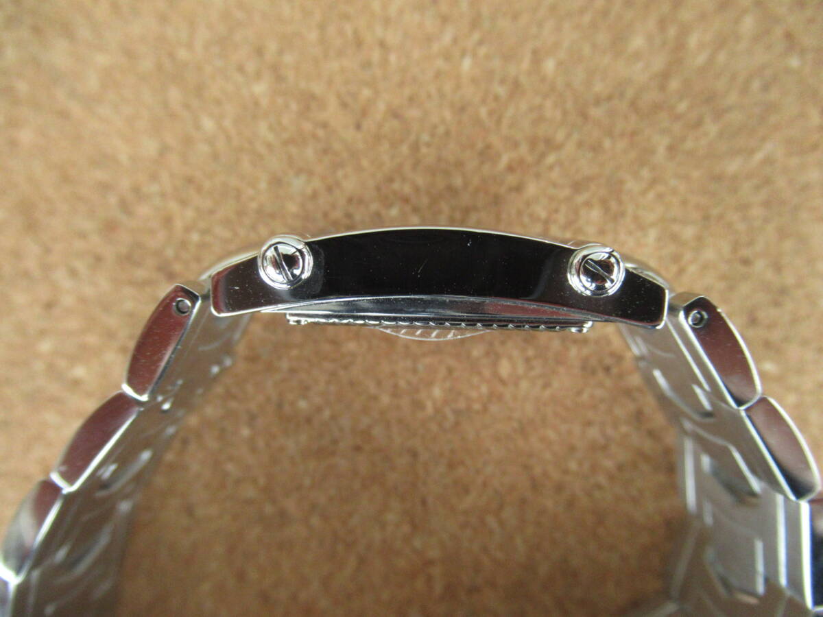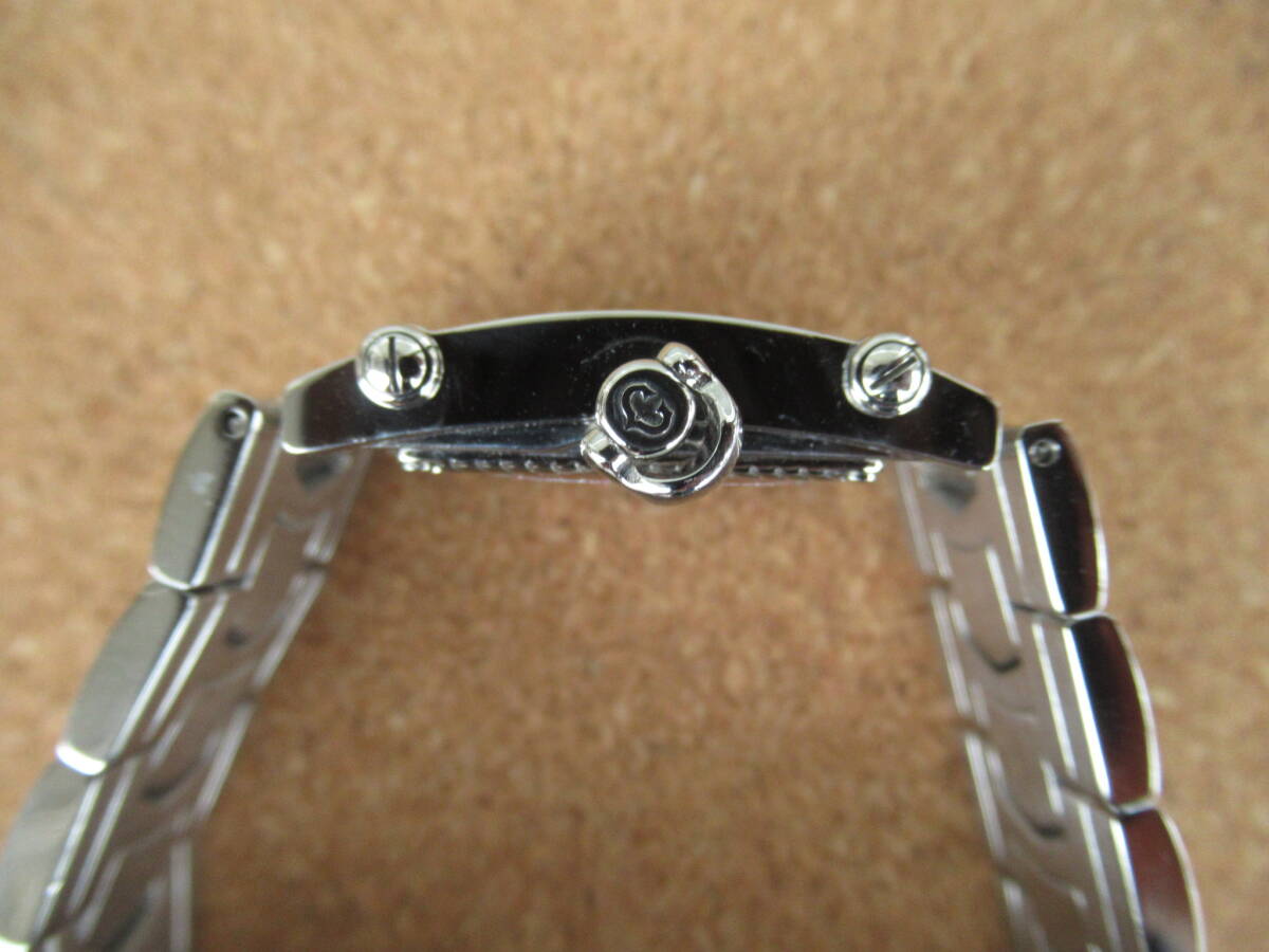 フィリップシャリオールのコロンブス《Ref.CCSTRM》レディースモデルです!! 2Pダイヤ入りピンクシェル文字盤がインパクトある時計です!! 通常のレディースより一回り大きく、幅広のブレスレットが付いた珍しいモデルです。 ケース幅は約23ミリ、腕周りは測定具計測で約16.5センチでコマを外す事で短く出来ます。