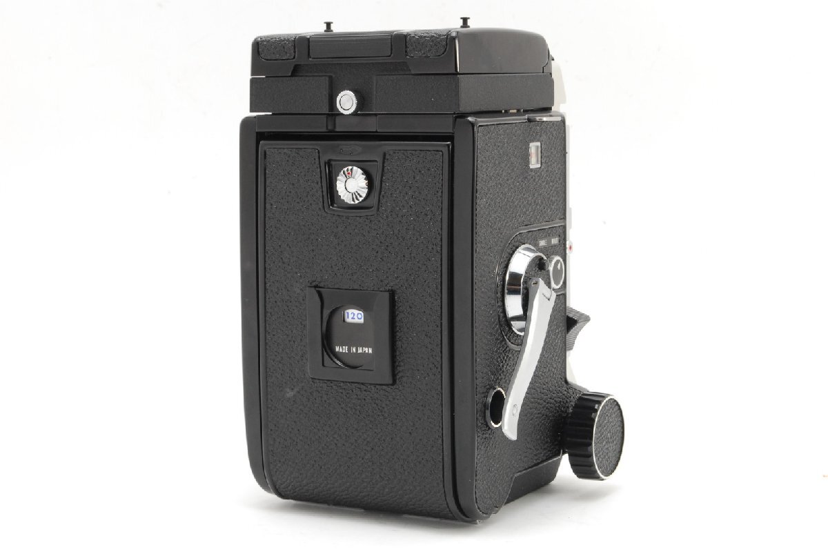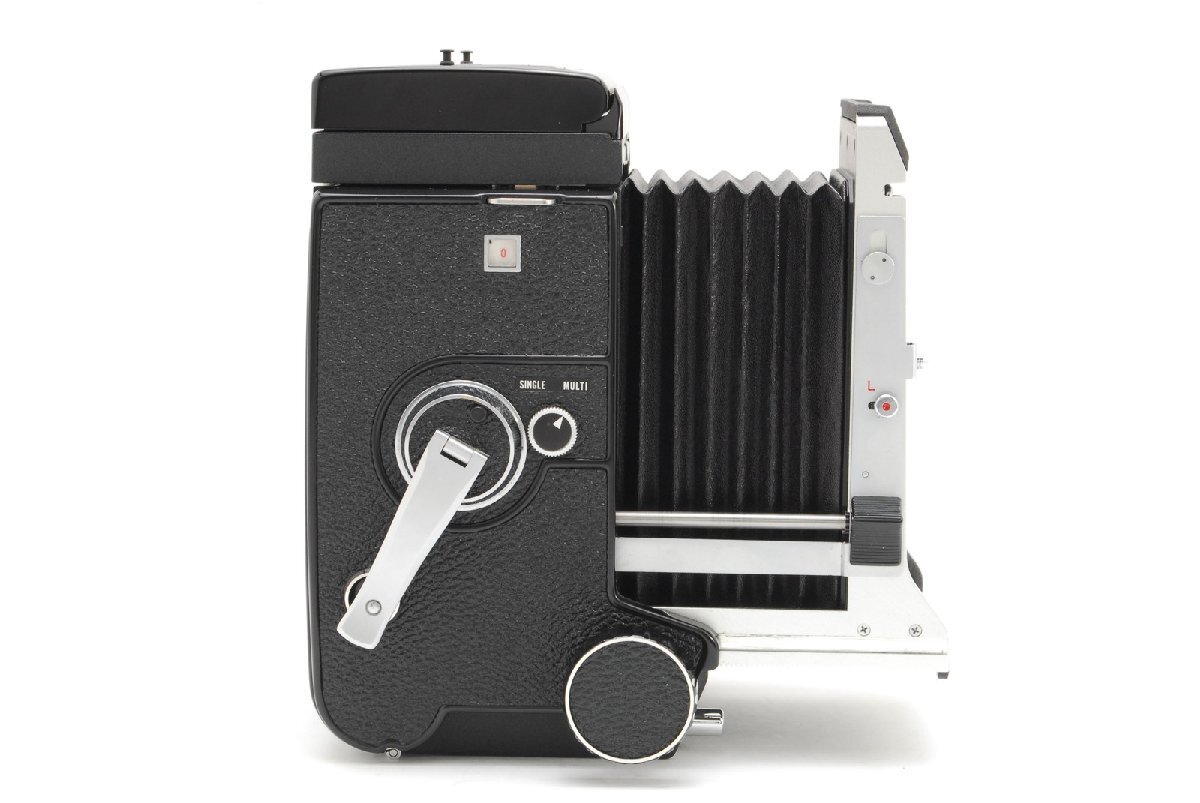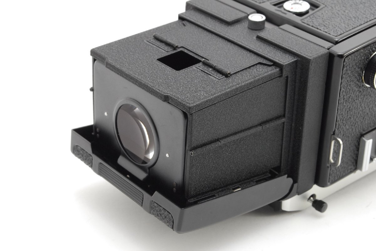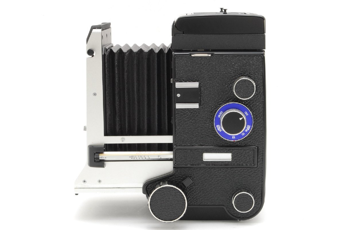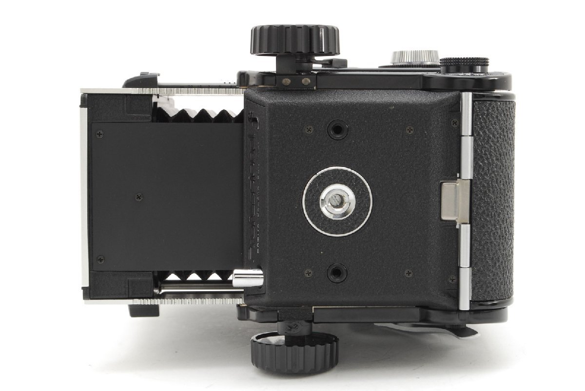 モルトプレーンが剥がされています。テイクレンズ(下のレンズ)の周辺にバルサム切れが見られます。このような症状なので現状渡しのジャンク品です。ただ、バルサム切れについてはレンズの周辺なので今のところ写りに大きく影響はしないと思います。レンズ内に強い光を当てたところ、ほんのごく僅かにとても薄いクモリを感じるところがある程度でカビはなさそうです。点検時においては各速度変化してシャッター切れました。フィルムを装填して巻き上げ、カメラのシャッターボタンでシャッター切れました。フィルムカウンターも動作していました。蛇腹も問題なさそうです。スクリーンにはチリが見られます。モルトプレーンはありませんが、外観においては全体的に目立ったキズなく年代を考えるとコンディションは良いと思います。