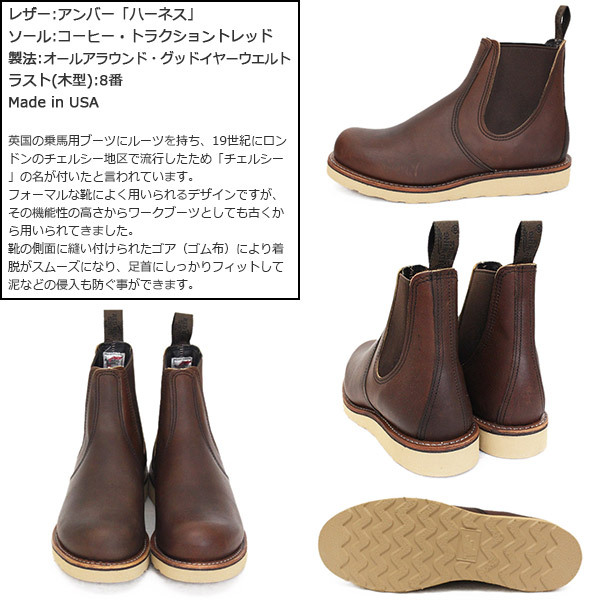 | 商品名 | REDWING (レッドウィング) 3190 Classic Chelsea クラシックチェルシー アンバーハーネス US7.5D-約25.5cm |