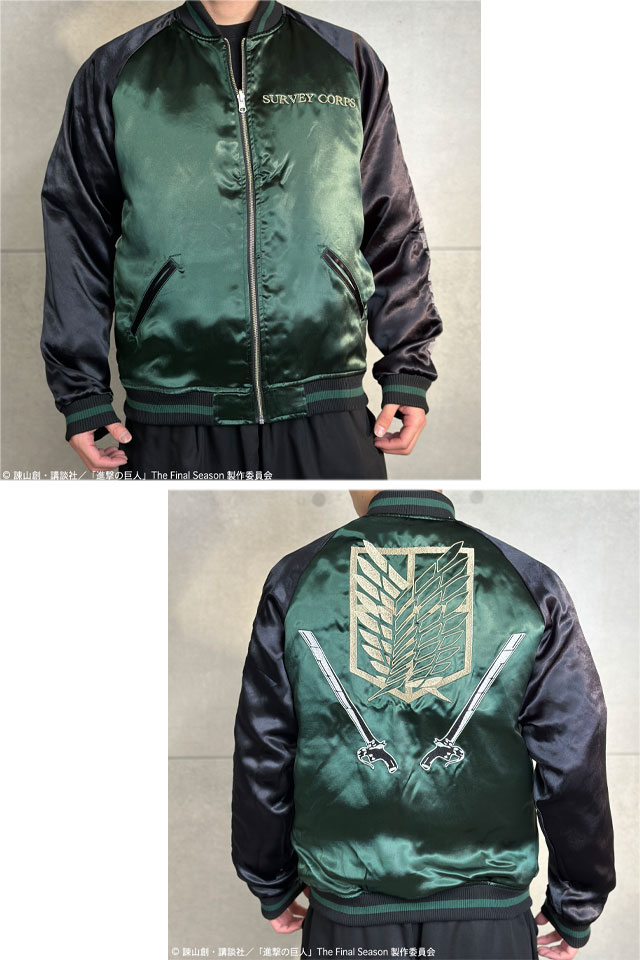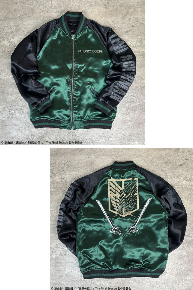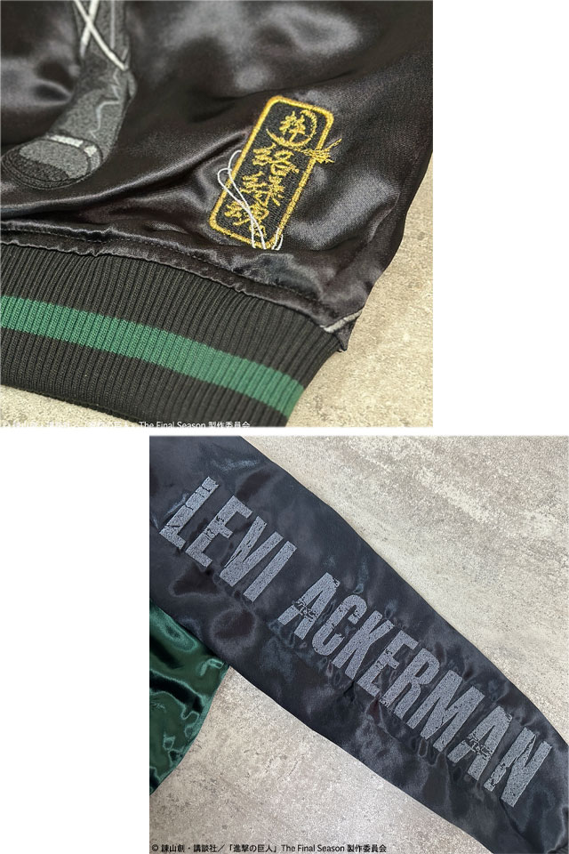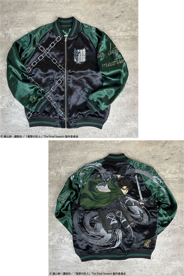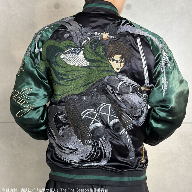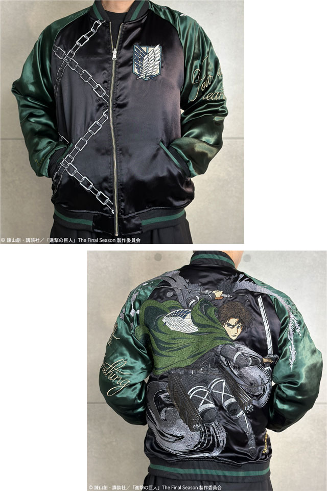 TVアニメ『進撃の巨人』と絡繰魂が初コラボレーション!! 本コラボでは《The Final Season》をチョイスし、最終話までの物語を投影したデザインに。 巨人を切り裂いたような刃傷を背景に、調査兵団所属の【リヴァイ】を大判刺繍!! 右袖にはいつも飲んでいた紅茶をモチーフにしたデザインを刺繍。 リバーシブル表面フロントに調査兵団のエンブレム、右身は【立体機動装置】での戦闘をイメージ。 リバーシブル裏面にすると、調査兵団が作成したようなスカジャンとして着用する事が可能! コラボならではの拘りとハイクオリティの一着です! | ||||||||||||||||||||