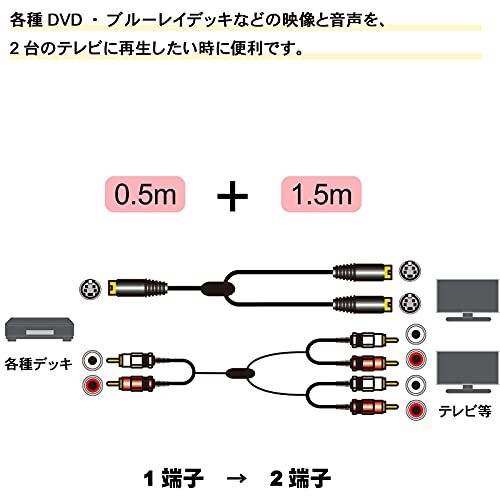 商品説明 | 分配S映像ビデオケーブル 2m(分配音声ケーブル付) 2台のモニターで見たい時など分配したいときなどに便利なコードです。映像・音声を分配します。S端子とRCA端子のついた機器に使用できます。 S端子プラグ、S端子プラグ×2、音声 ピン(RCA)プラグ×2、ピン(RCA)プラグ×4 ケーブル長2m(映像・音声とも分岐点まで50cm分岐後それぞれ1.5m) ※必ず分配方向でご利用下さい。(1S2S) ※分配した画像は明るさが低下します。 ※きれいな画像のまま保存したり再生する目的には対応しません。