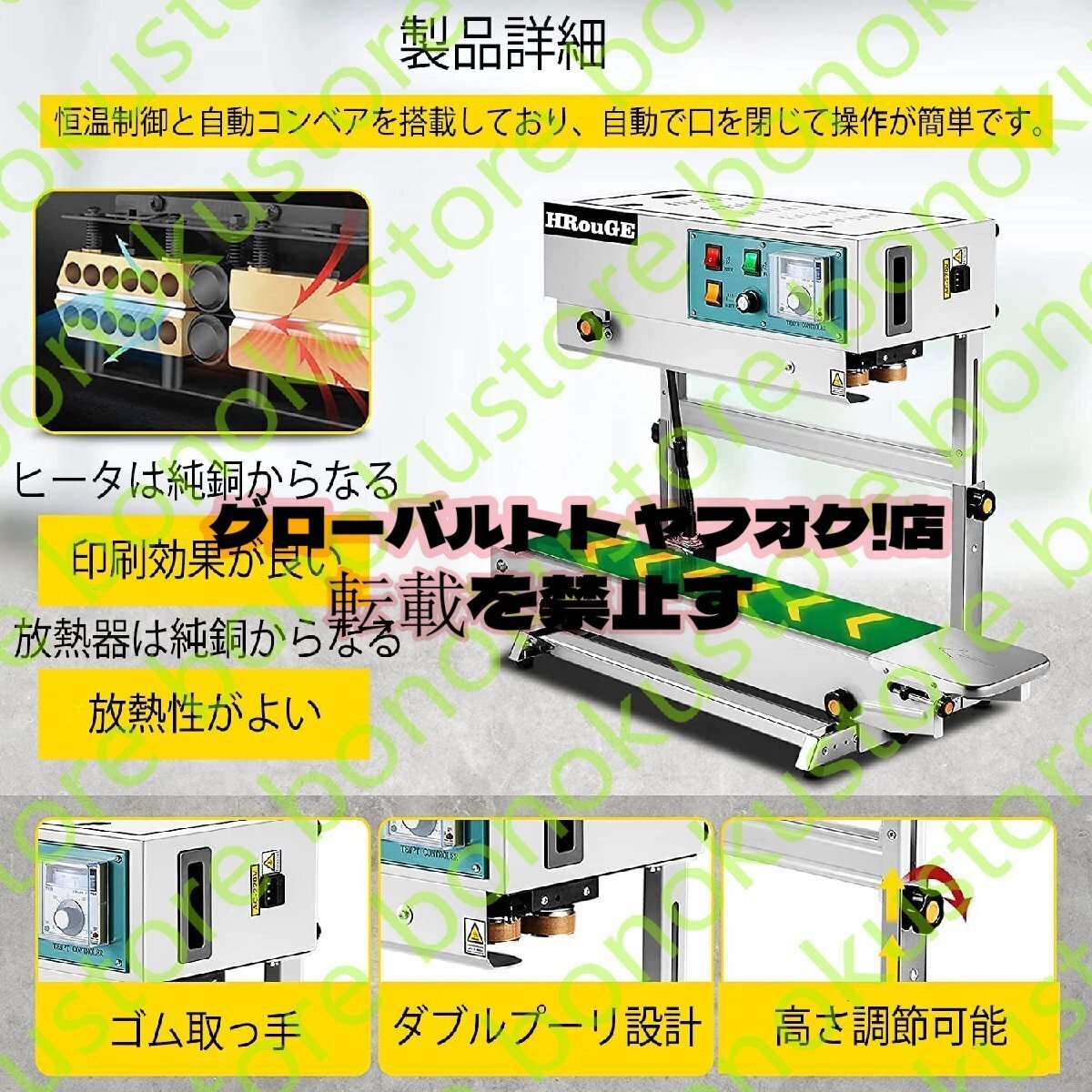 【幅広い用途】この連続シール機は両面の厚さが0.02 mm-0.8 mmの袋に適しています。例えば、複合膜、アルミ箔袋、牛革紙、ビニール袋などです。ベルトは5 KGを超える貨物を移送してはいけません。