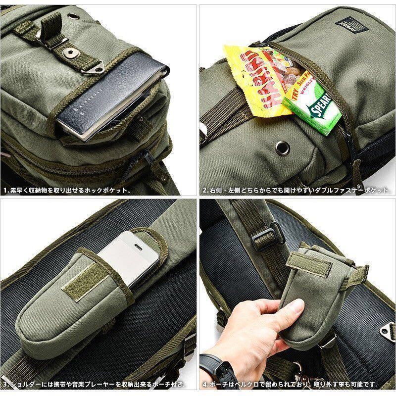 フロント上下にフラップポケット、ファスナーポケット、両サイドにメッシュポケットを設けているため、収納力は抜群です。ショルダー部分には、取り外し可能なスマホポケットも付いています。 本体メインルームはダブルファスナー仕様になっているため、荷物の出し入れもスムーズに行えます。ショルダーはナスカンを付け替えることによって、左右どちらにも肩掛けできるようになっています。