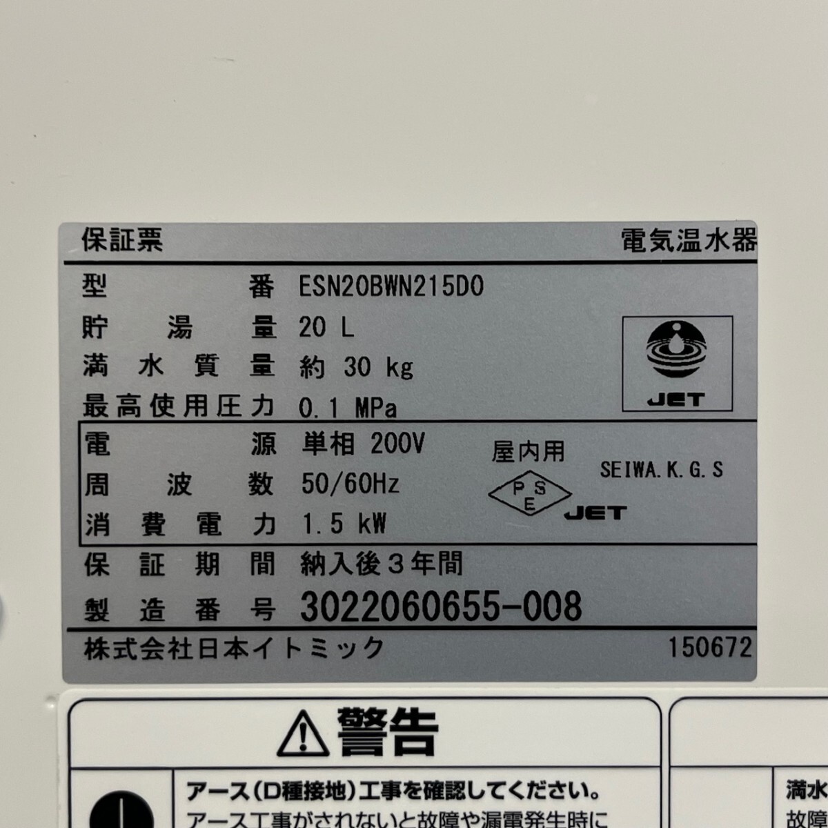 iTOMIC ESN20BWN215D0 電気給湯器 2020年製 単相200V 希望小売価格 196000円 動作確認済み 通電確認済み (3) | ||