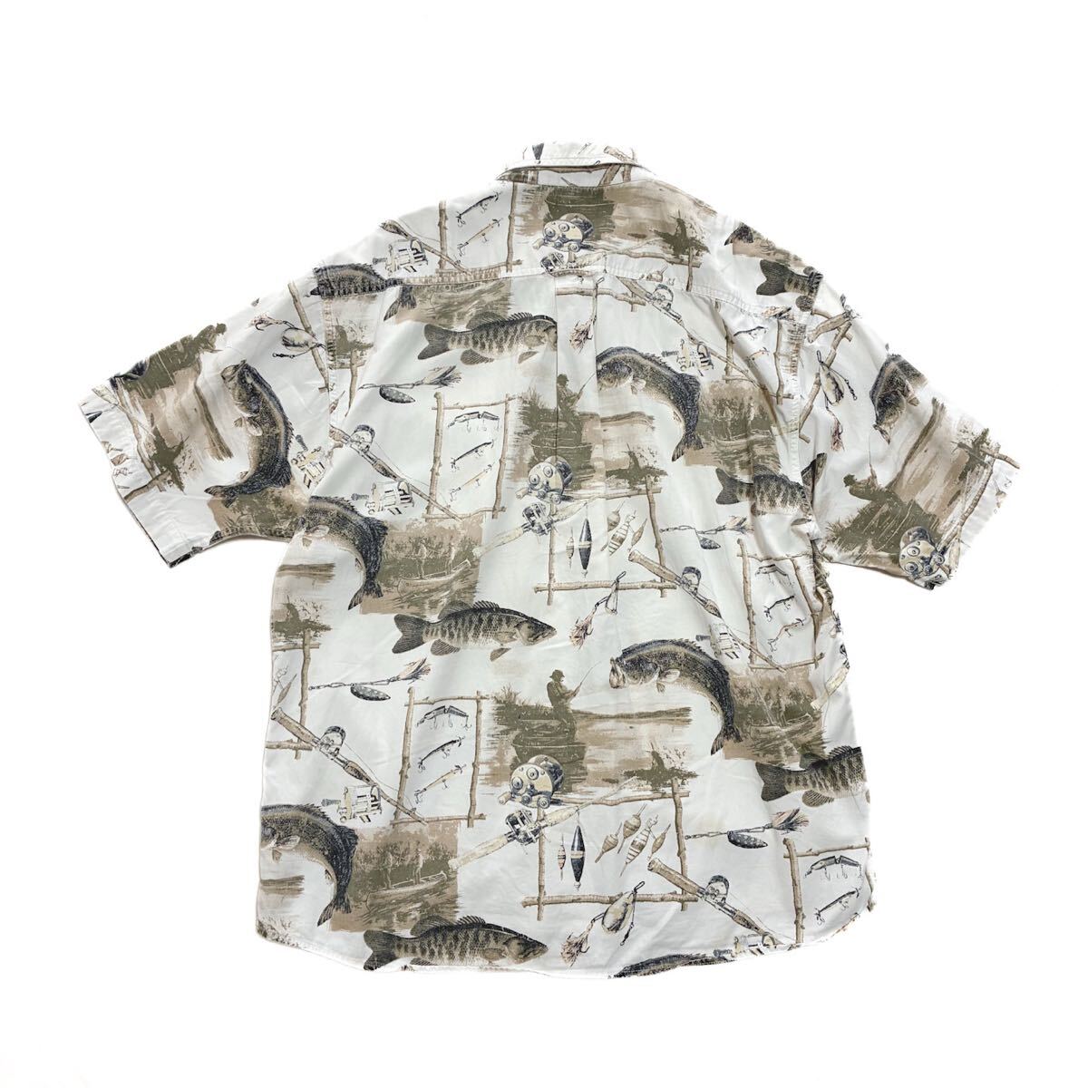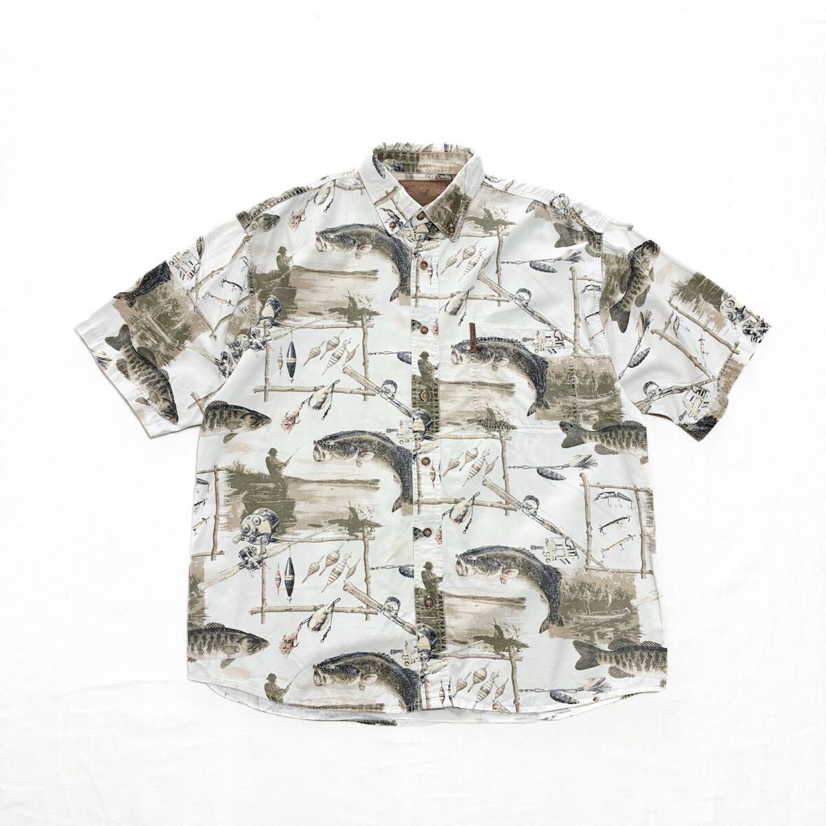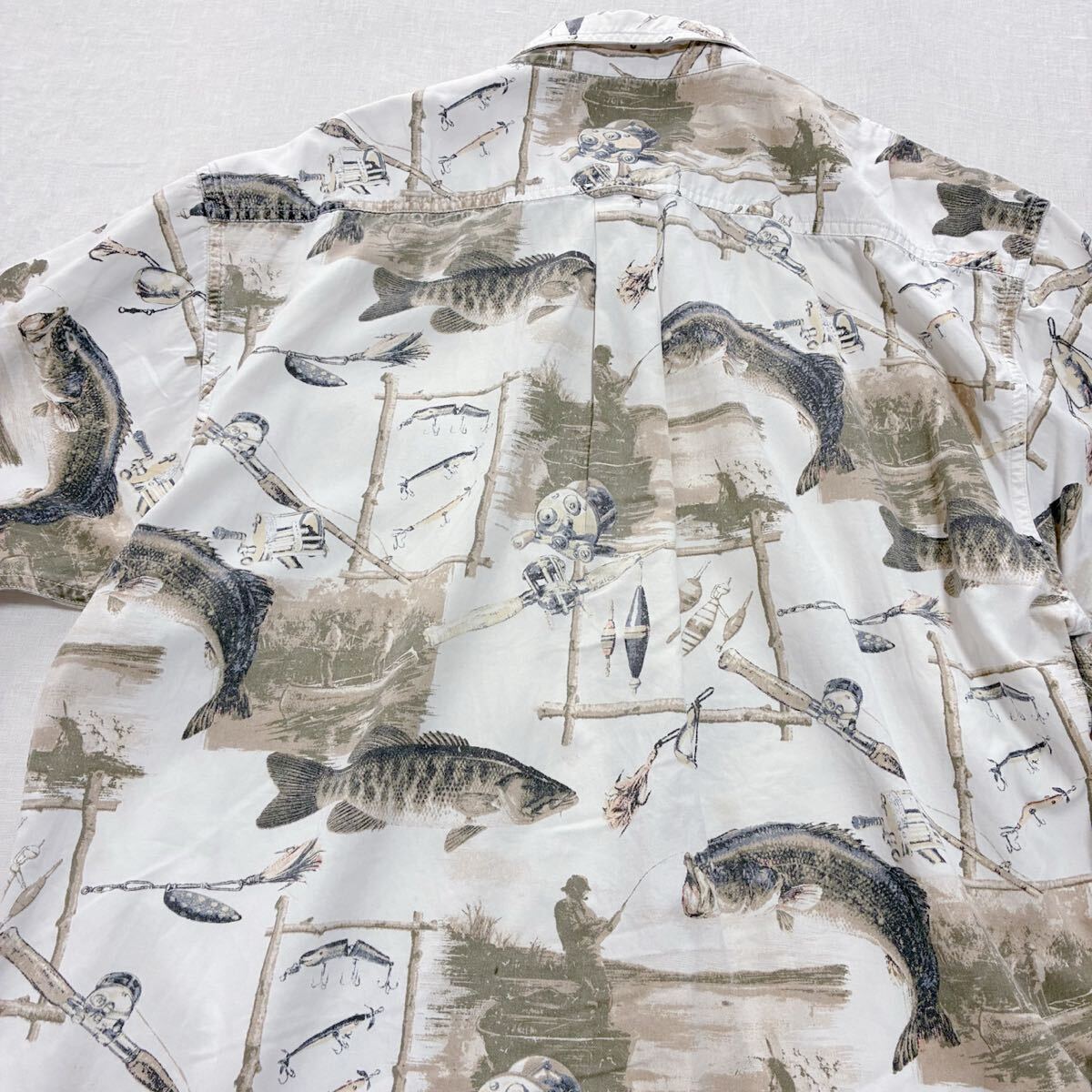 90s NORTH RIVER フィシング 魚 総柄 半袖 ボタンダウンシャツ L ブラックバス / llbean