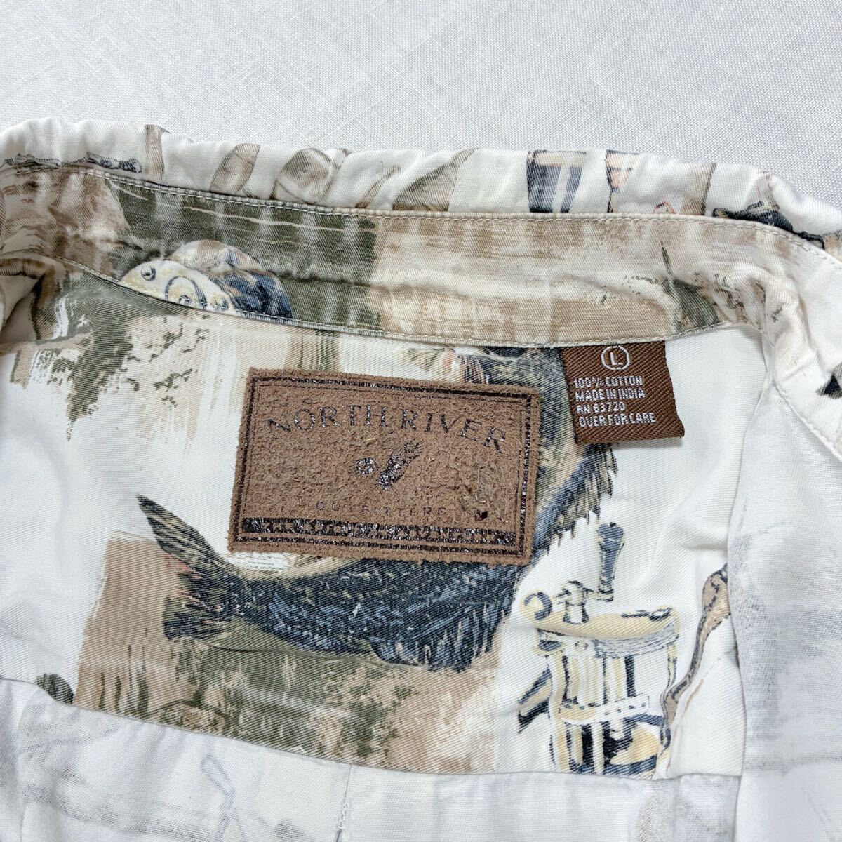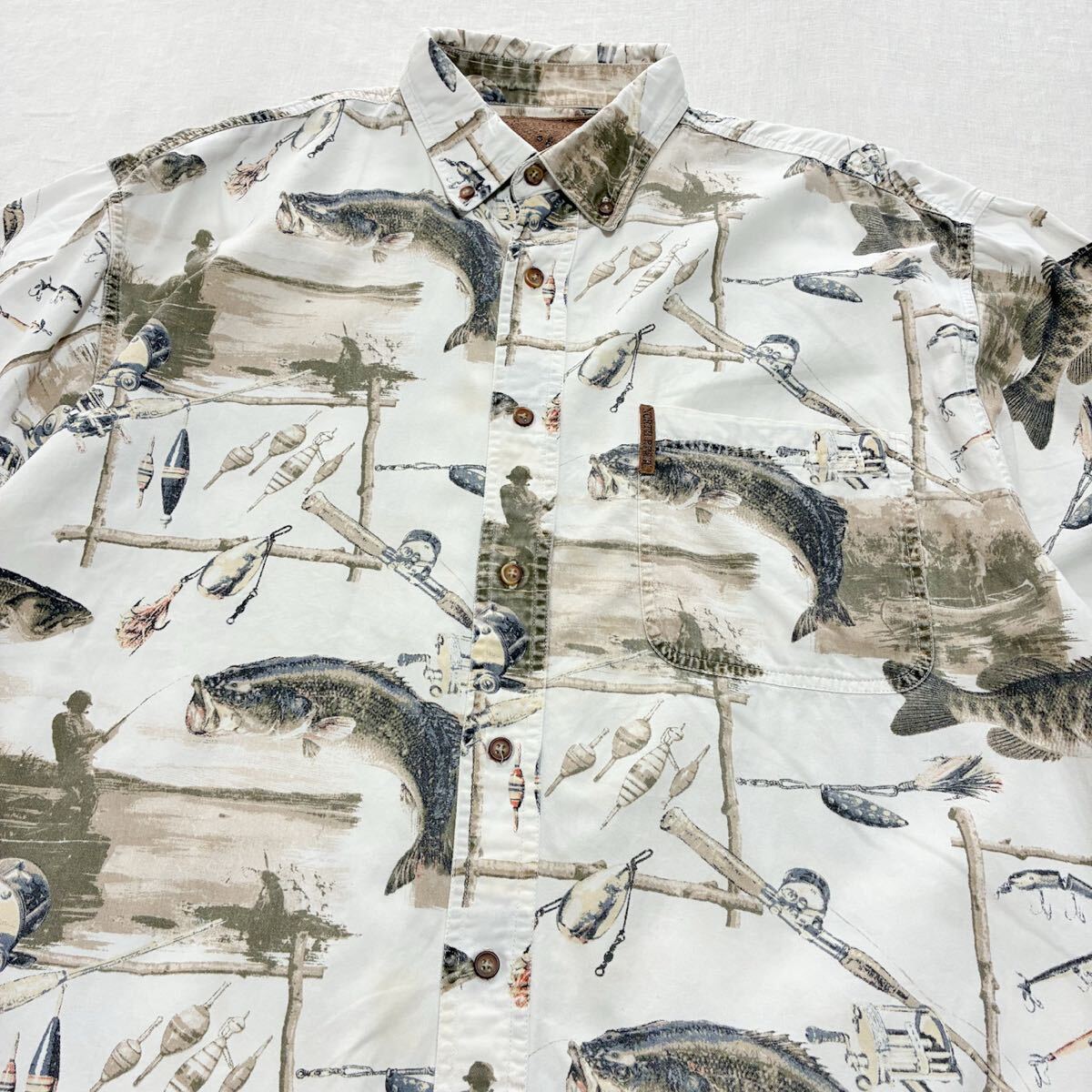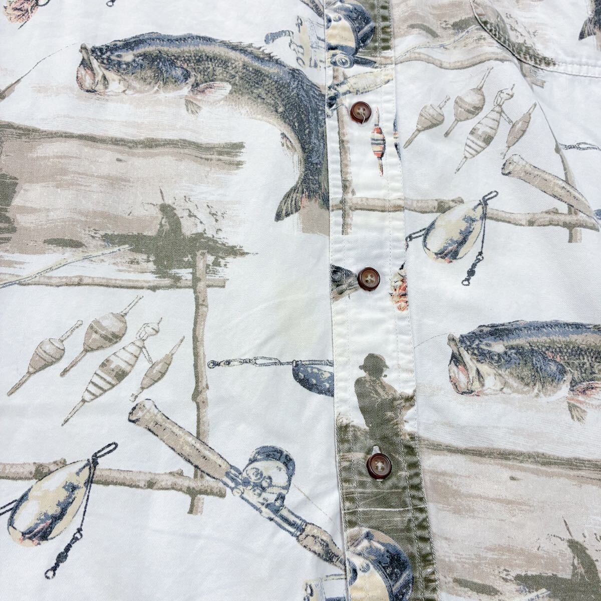 90s NORTH RIVER フィシング 魚 総柄 半袖 ボタンダウンシャツ L ブラックバス / llbean