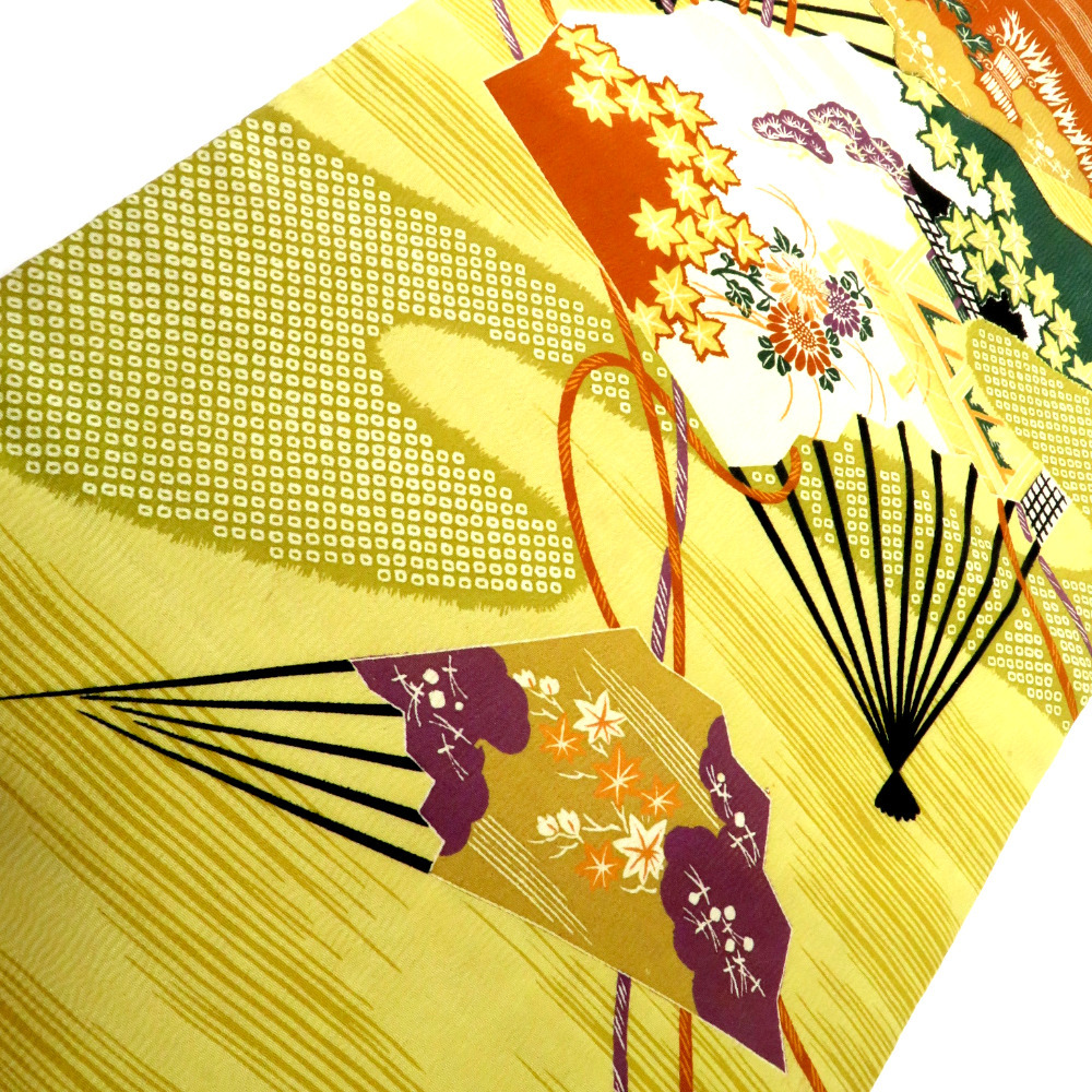 | 名古屋帯 アンティーク帯 昔名古屋帯 カラシ 多色 扇 庭園風景 霞に匹田 金コマ刺繍 昔帯 九寸帯 レトロ 明治・大正ロマン 長さ328.6cm |