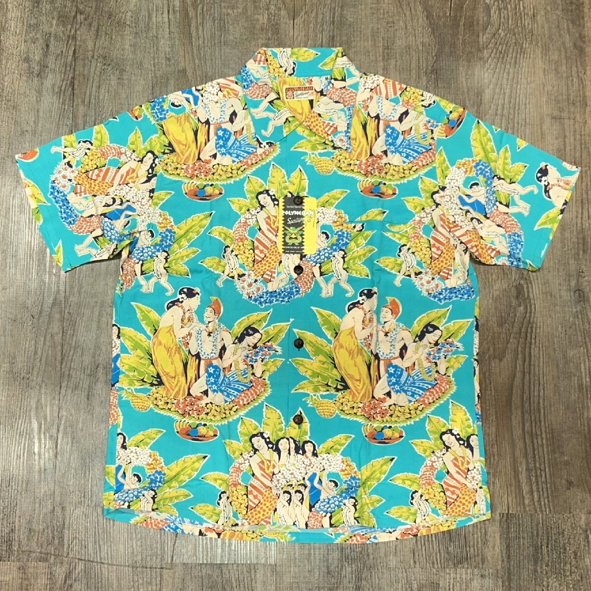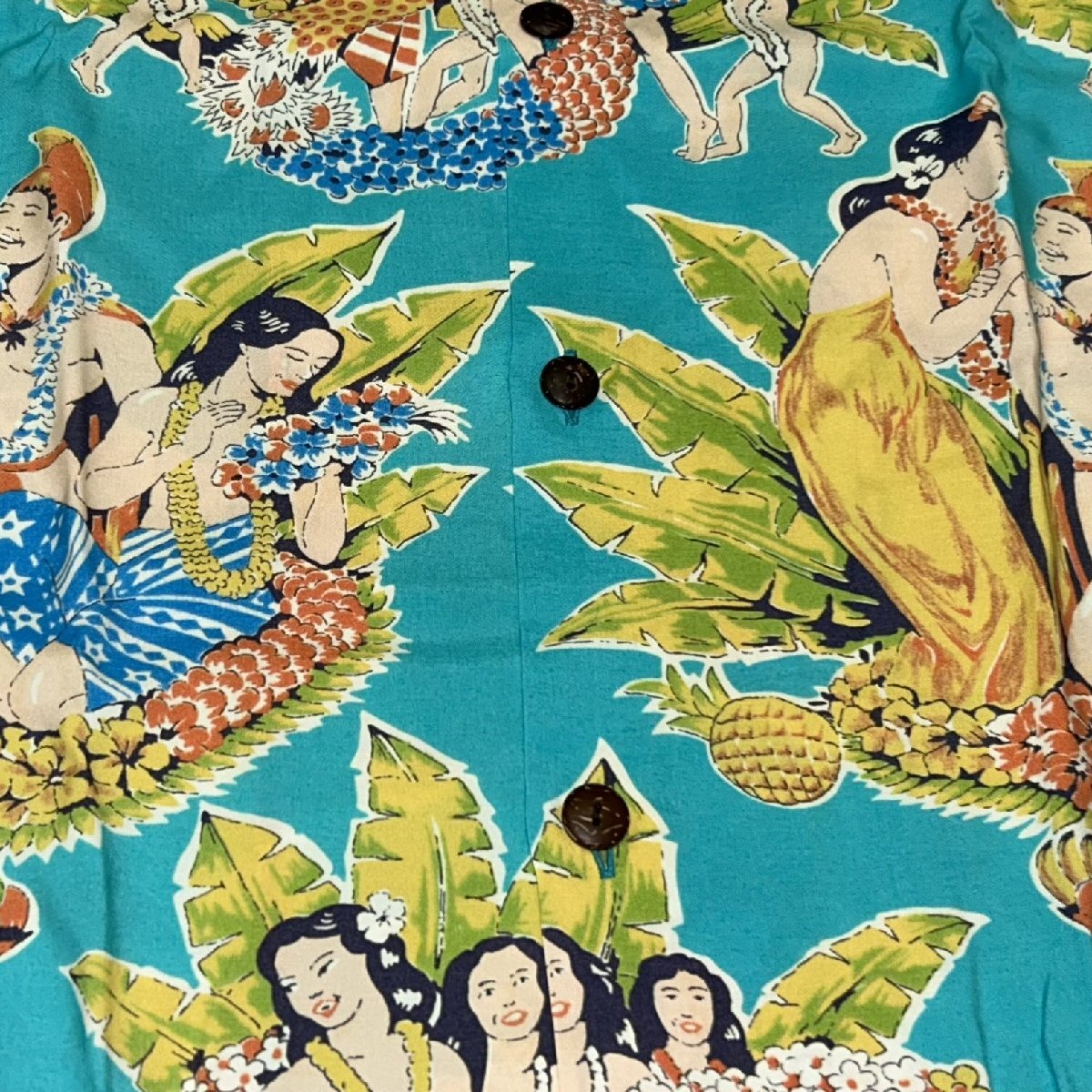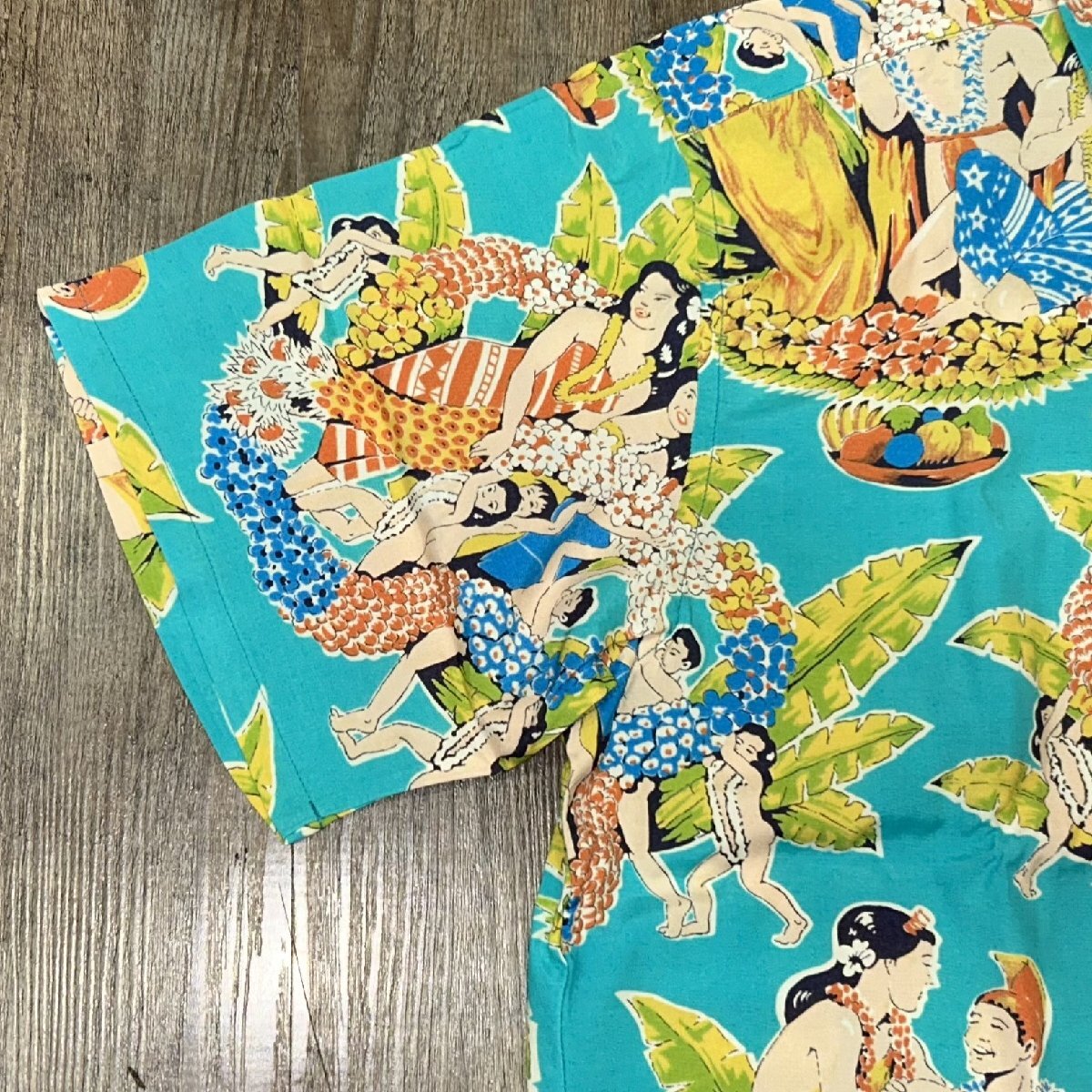 20世紀初頭より、サンフランシスコからホノルルまでを結ぶハワイ航路として名を馳せた「マトソン・ライン」。その船内のレストランで使用するメニューの表紙のデザインを任されたのが、画家のユージン・サベージ。当時、サベージは様々な企業からのオファーを受け、多方面にわたって広告デザインを手掛ける人気アーティストであった。彼はマトソン・ライン用に6枚の作品を描き下ろしたが、その中のひとつ「ALOHA~UNIVERSAL WORLD」の主要部分をもとに構成されたアロハシャツがこの「セレブレーション」。