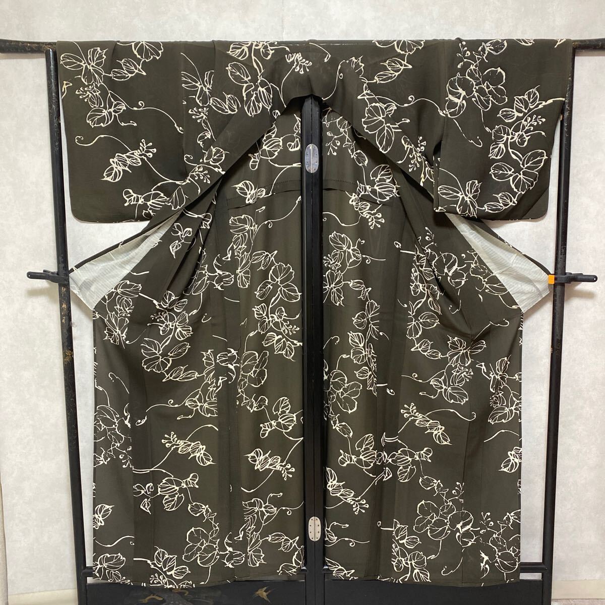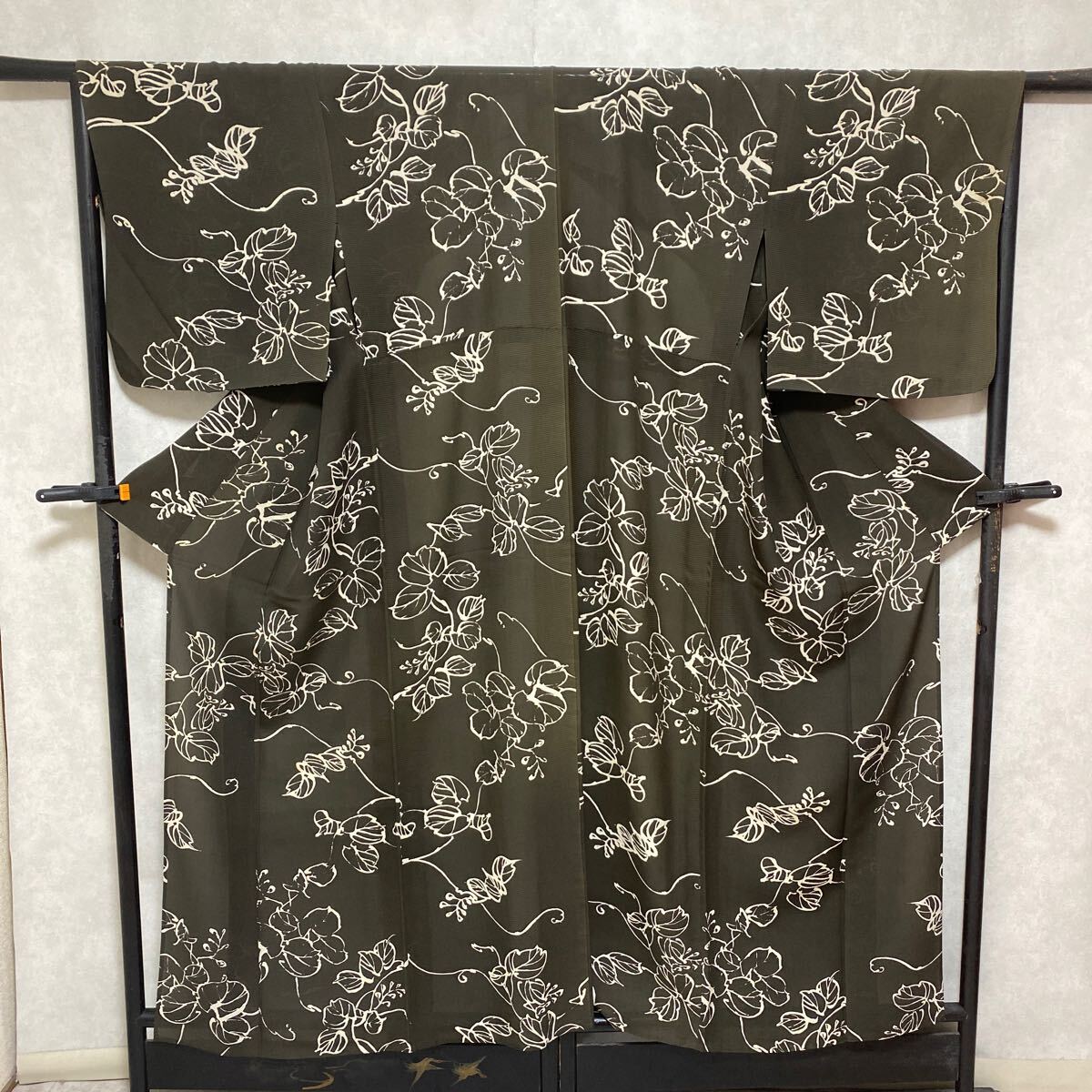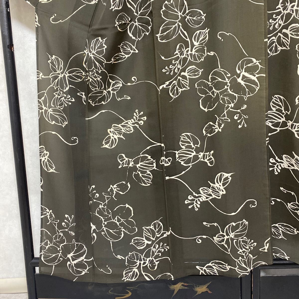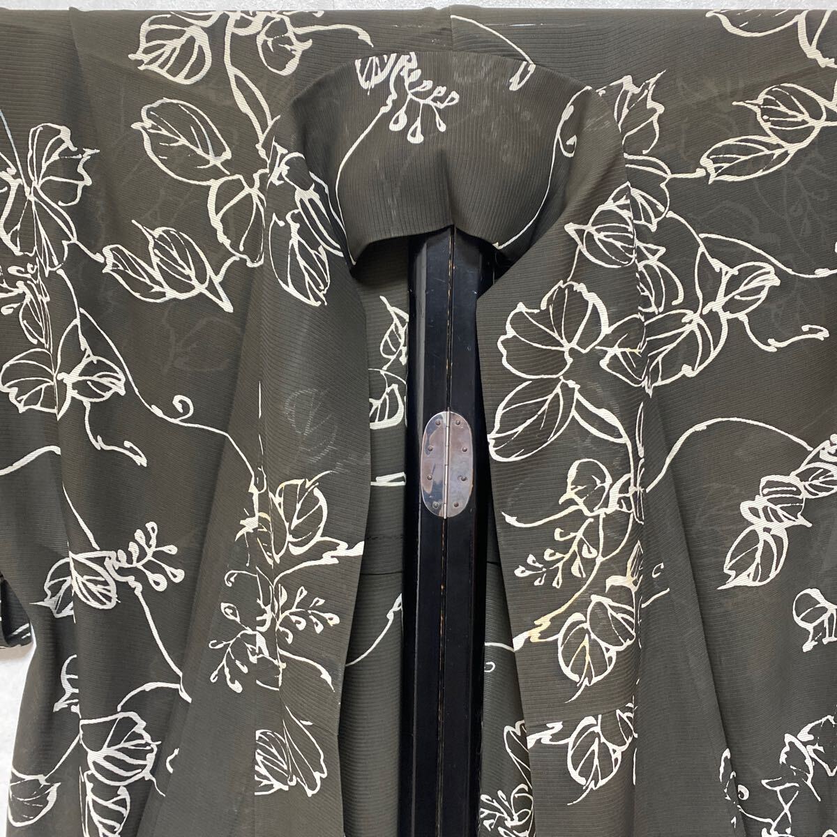 アンティーク 単衣 絽 夏物 着物 正絹 昭和レトロ 大正ロマン モダン 和洋折衷コーデ リメイク カーキ色 葉 か10-9w