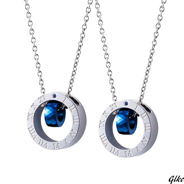 時計の文字盤をイメージしたローマ数字に、鮮やかなブルーストーンが輝くペアネックレス。