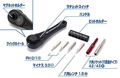 • 付属品:ミニビット4種 計6個 (PH 0 / 1 / マイナス3.0 / 六角レンチ1.5 / 六角ソケット 4.2 / 4.5) / ビットホルダー