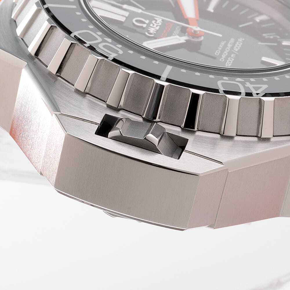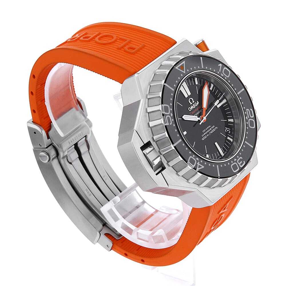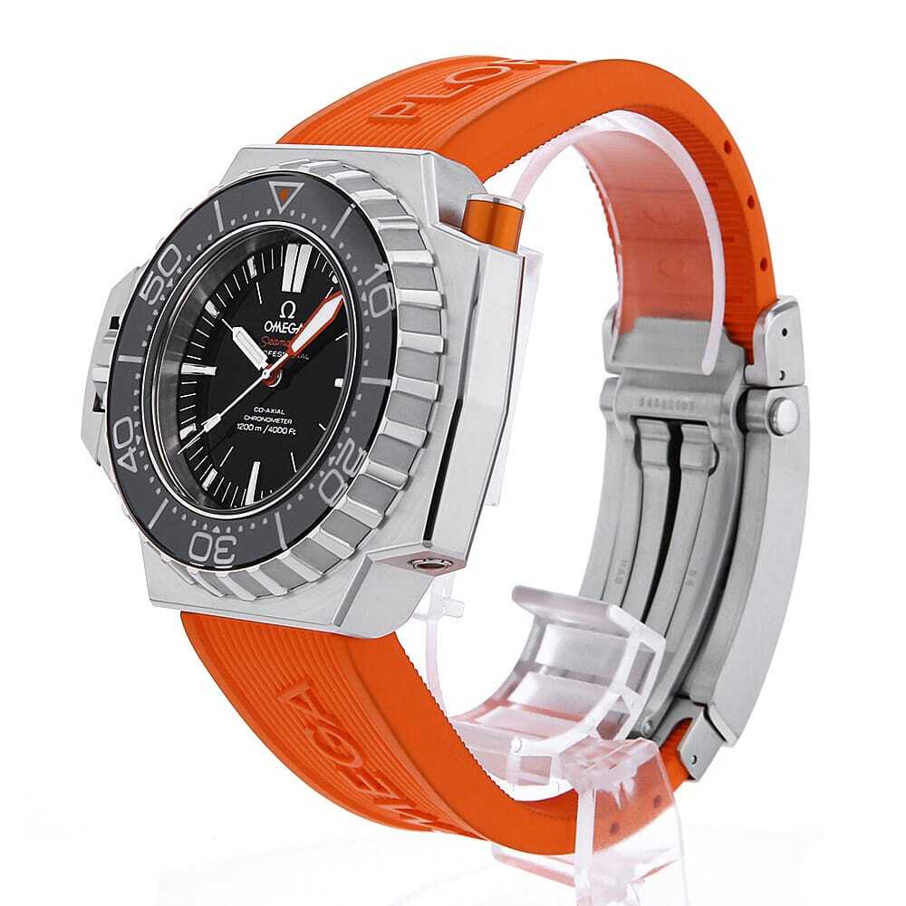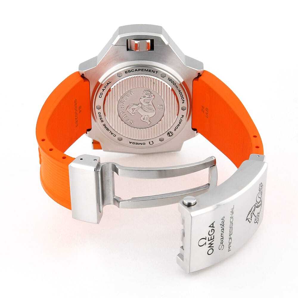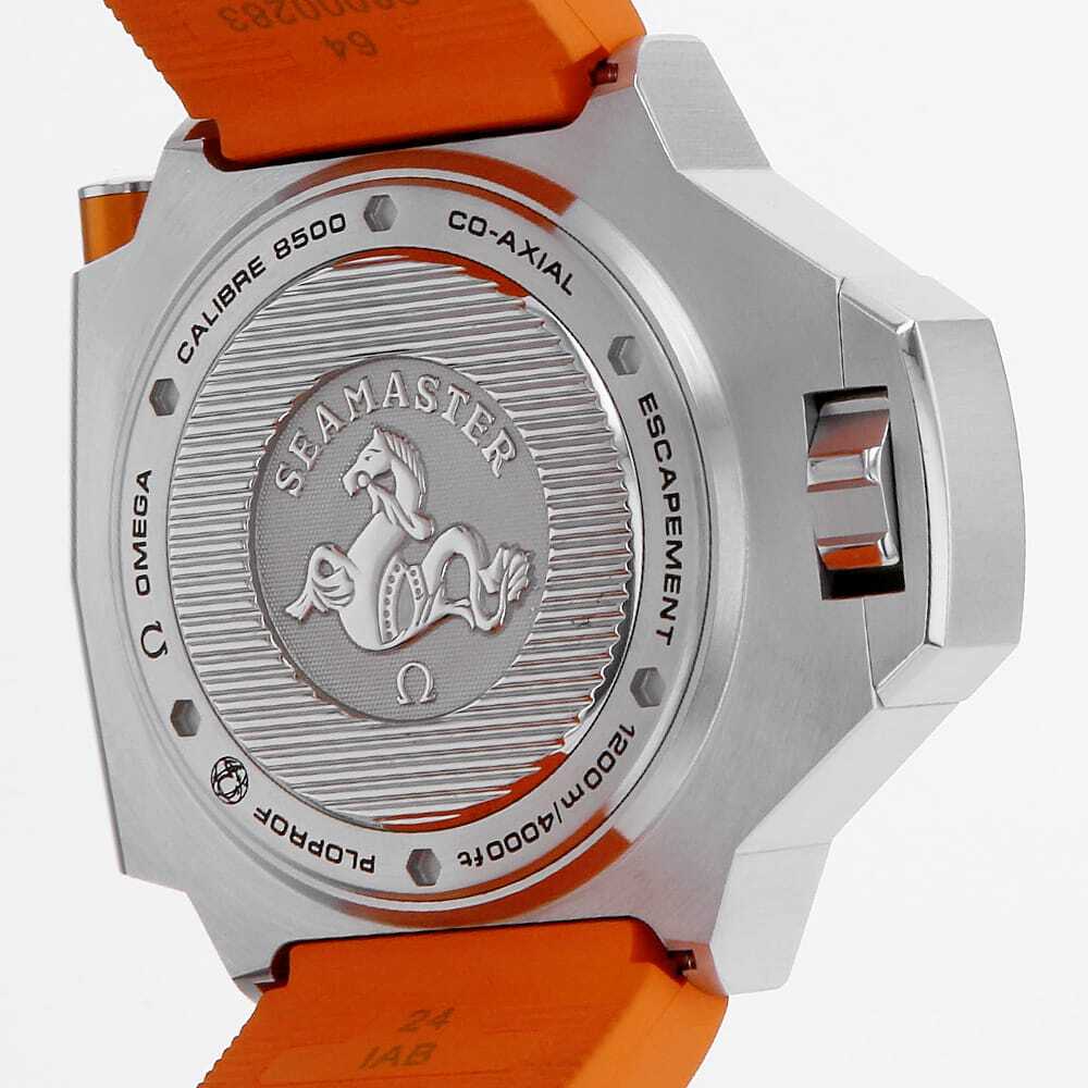 モデル情報 | 2009年オメガは、深海の極限環境に耐えることで世界的な評価を得ていた"シーマスター 600M プロフェッショナル"を刷新し、新たに"シーマスター プロプロフ 1200M"を発表しました。本モデルは、最先端の技術革新とオメガを象徴する伝統的なダイビングウォッチの意匠を融合させ、海との深い関わりを物語るタイムピースです。鮮やかなオレンジのラバーストラップがスポーティなアクセントを加え、機能性とデザイン性を兼ね備えた一本に仕上がっています。120気圧(1200m/4000feet)という高い防水性能に加え、ねじ込み式リューズ、自動ヘリウムエスケープバルブ、ベゼルセキュリティプッシャーを備えています。ムーブメントにはコーアクシャルキャリバー8500を搭載。 |