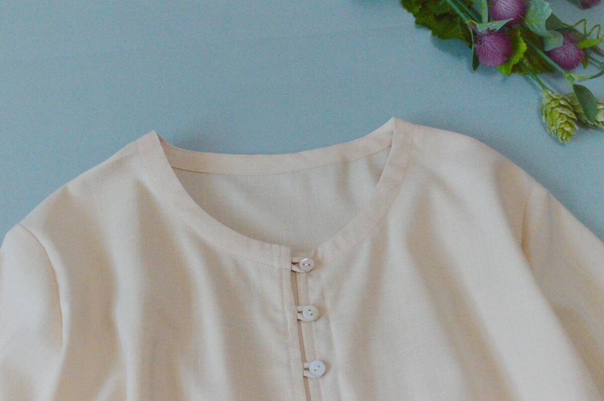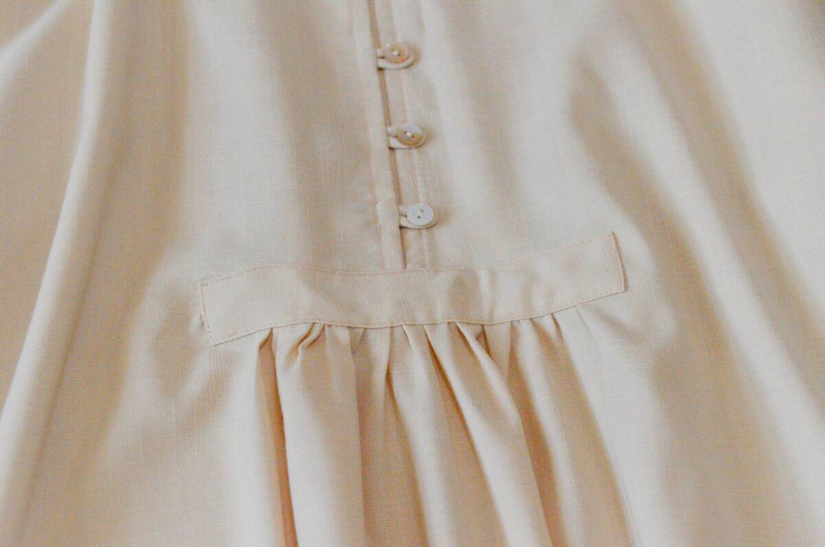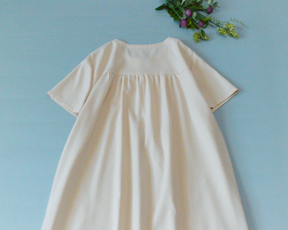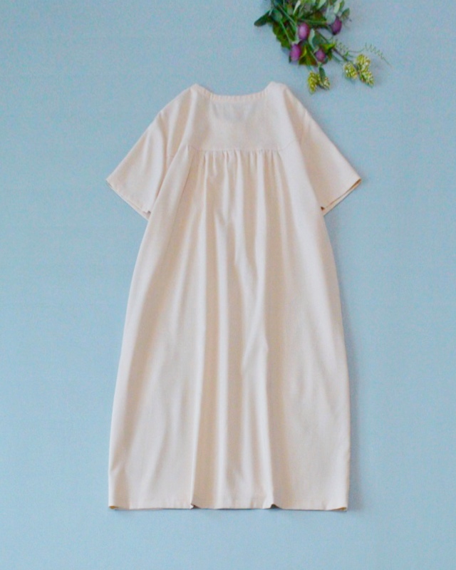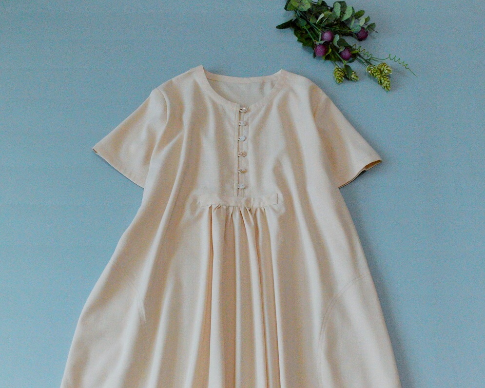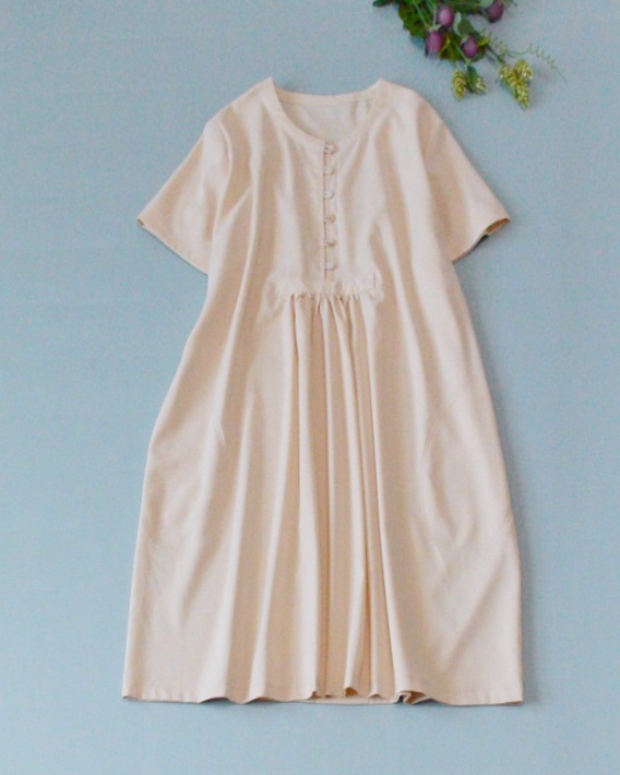前胸釦本開きポケット付きギャザー寄せ大人可愛い半袖ワンピース♪