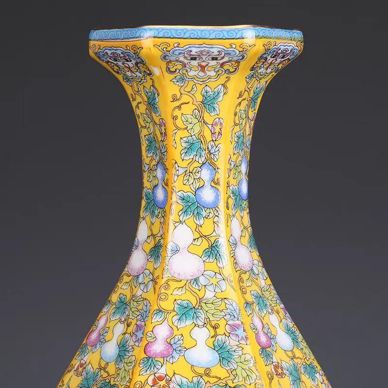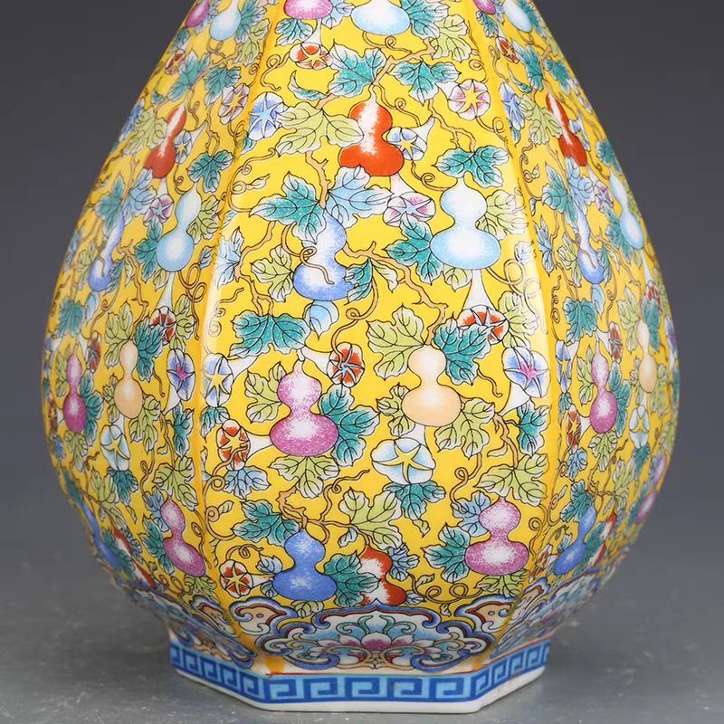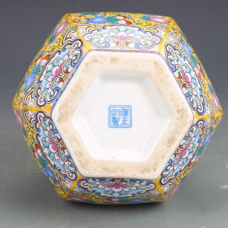 清時代 雍正年製款 古陶磁器 黄地 粉彩 花卉紋 花瓶 賞瓶 磁器 文案置物 擺件 時代物 古董品 骨董 旧家蔵出 唐物 中国古玩 古美術品