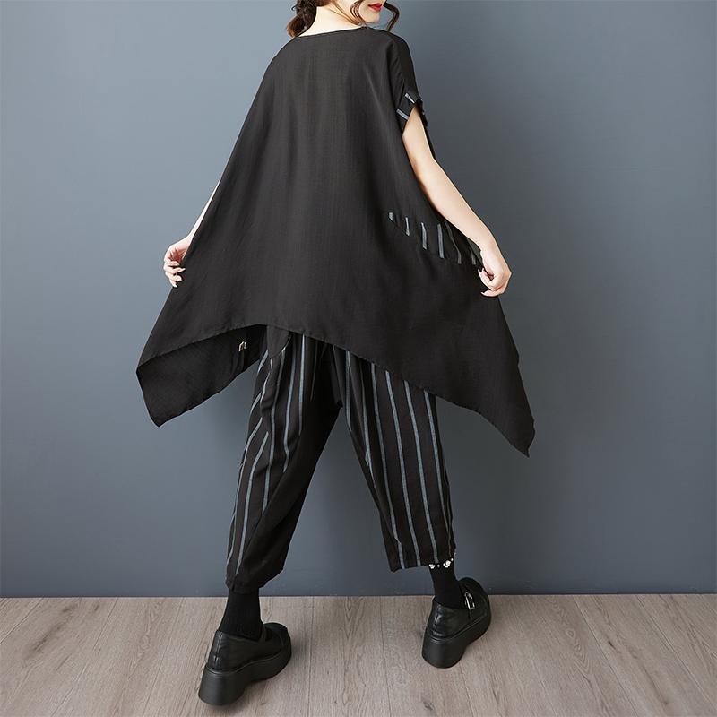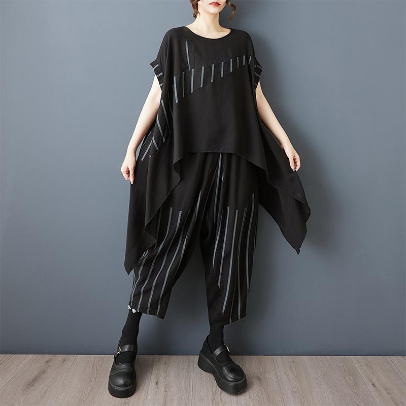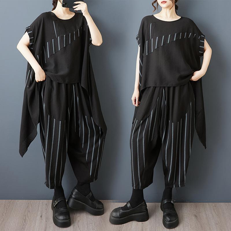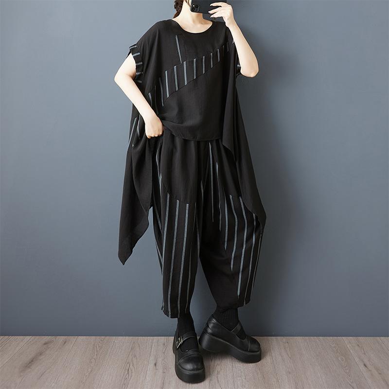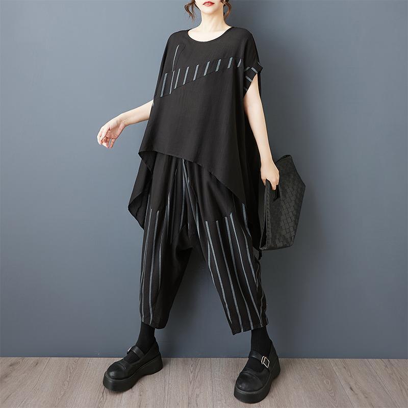 大きいサイズ セットアップ イレギュラー トップス レディース 春夏 新品 半袖 パンツ ストライプ ウエストゴム 変形裾 上下セット
