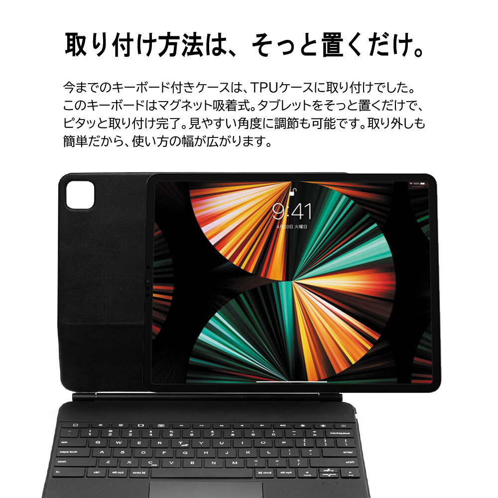 | 商品説明 | カラー:シーブルー ※商品仕様の説明上、別のカラーの画像も掲載しております。 ※画像のタブレットはイメージになります。 マジックキーボード仕様でiPadを近づけるとマグネットでぴたりとくっつきます。フローティングカンチレバー スタイルを採用し、横から見ると浮いているようにiPadを設置することができます。キーボードはトラックパッド搭載していますのでマウスを使う必要がありません。長時間の文字入力でも疲れないタイピングキー。初期設定が終われば電源を入れるだけで自動接続。簡単な初期設定でノートPCに変身します。Bluetoothで接続で煩わしいケーブルは必要なし。シンプルでスマート。約130°までのケース開閉機能と自動スリープ/ウェイク機能を備えます。リチウムイオンポリマー電池内蔵。充電式。※充電ケーブル付属(USB TYPE-C入力) |