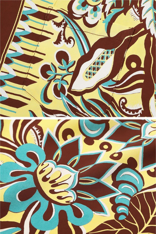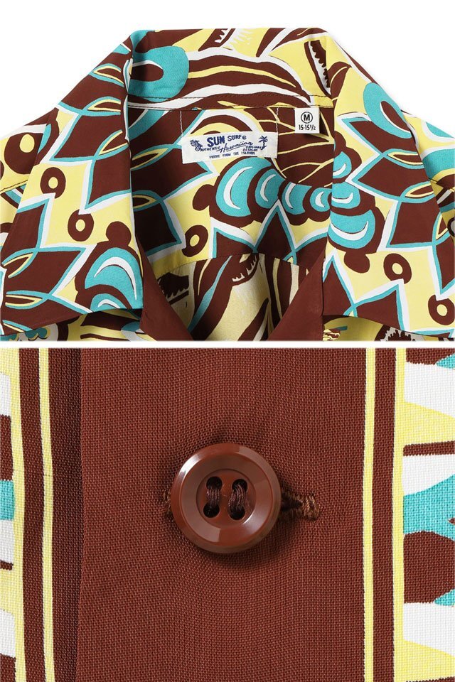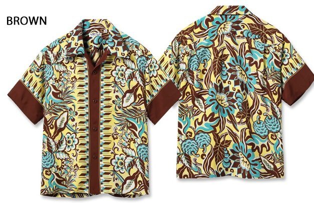 アロハシャツの黄金時代とされる1930~50年代にかけて作られた「ヴィンテージ」と呼ばれる貴重なアロハシャツを再現し、現代に蘇らせているブランド「SUN SURF」から、レーヨンアロハシャツ「FLOWER FIELD BORDER」(SS39430)のご紹介です。 抽象的に描かれた南国の草花が強烈なインパクトを放つ一枚。 植物のモチーフで構成されたデザインで、前身頃にボーダー・パターンができるようにモチーフがレイアウトされています。 また、生地全体の中央部分はオールオーバー・パターンでデザインされ、後身頃の部分に使われています。 生地の両端の部分には無地場を作り、前立て部分や襟、袖口などに使用。 箇所によって柄と無地場がアクセントになるように計算し、プリントされた非常に興味深い一枚です。 ボディーには、てろんとしたフィラメントレーヨン生地を採用しました。 | ||||||||||||||||||||||||||||||