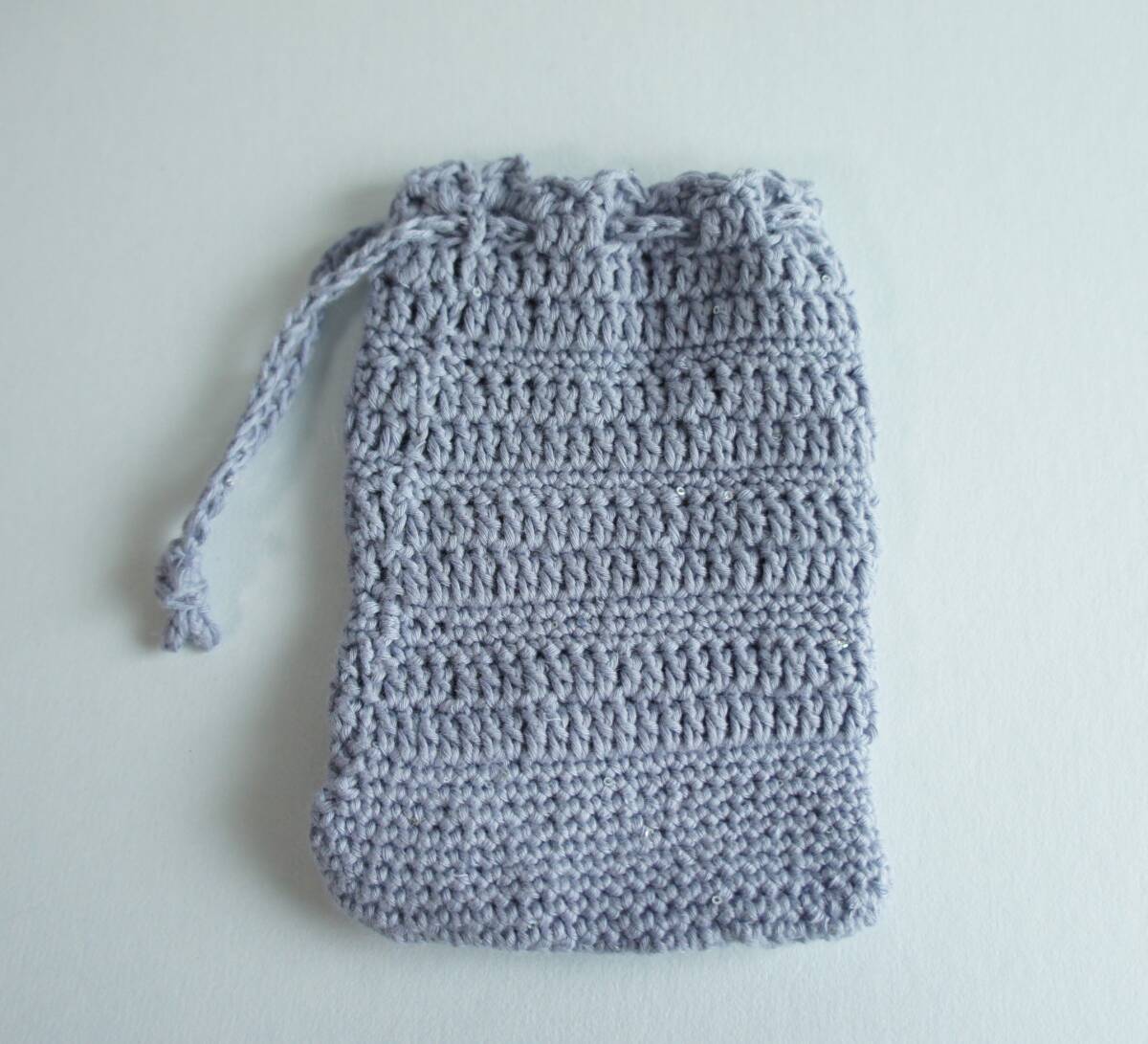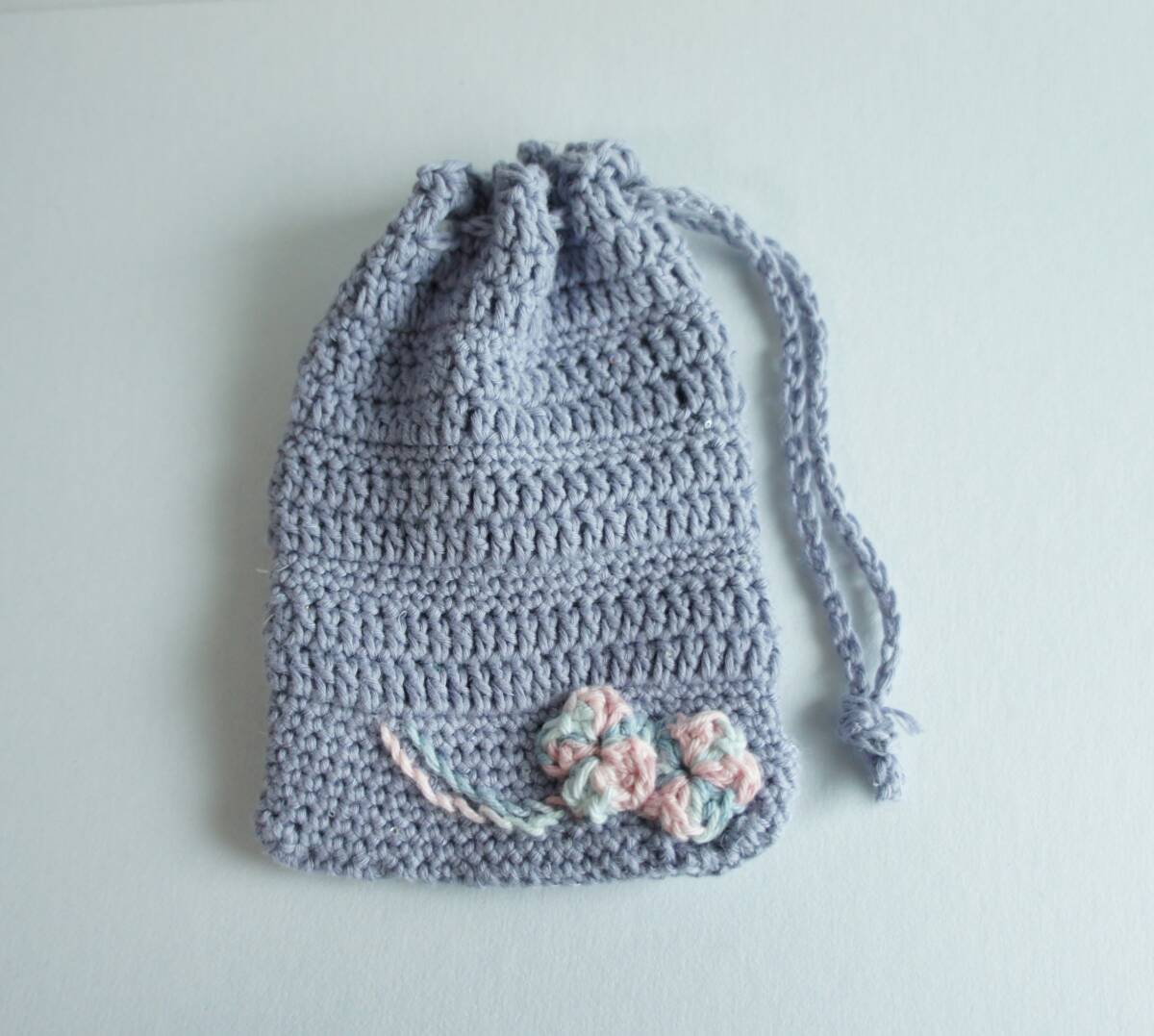ハンドメイド 巾着 かぎ針編み 手編み 淡いパープル色 極小 スパンコール 入 お花の付き。