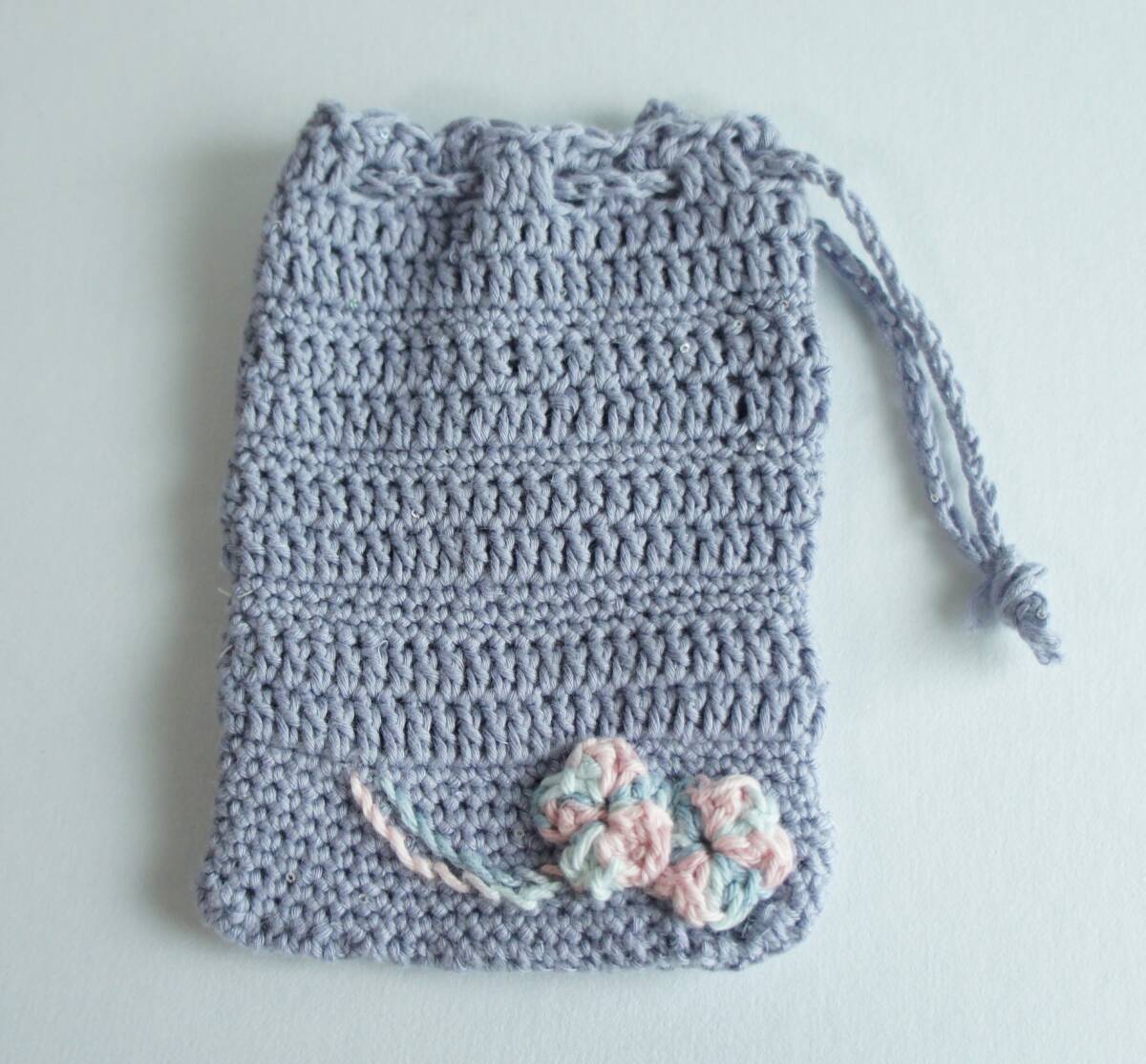 ♪ ハンドメイド 巾着 かぎ針編み 手編み 淡いパープル色 極小 スパンコール 入 お花付き