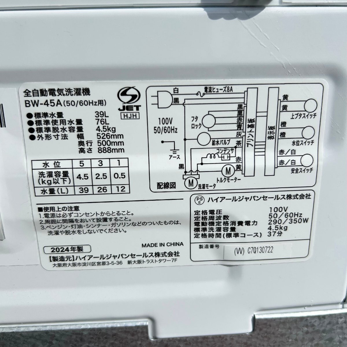 札幌市内送料無料●Haier/ハイアール● 全自動洗濯機 BW-45A 2024年製 4.5㎏ ホワイト 札幌 中古 地下保管 0608
