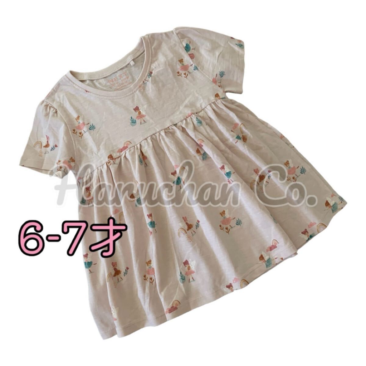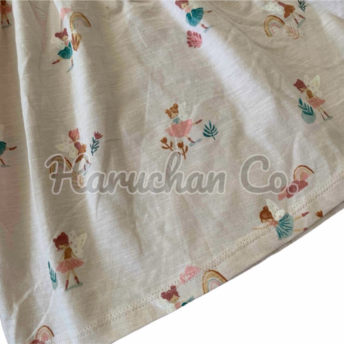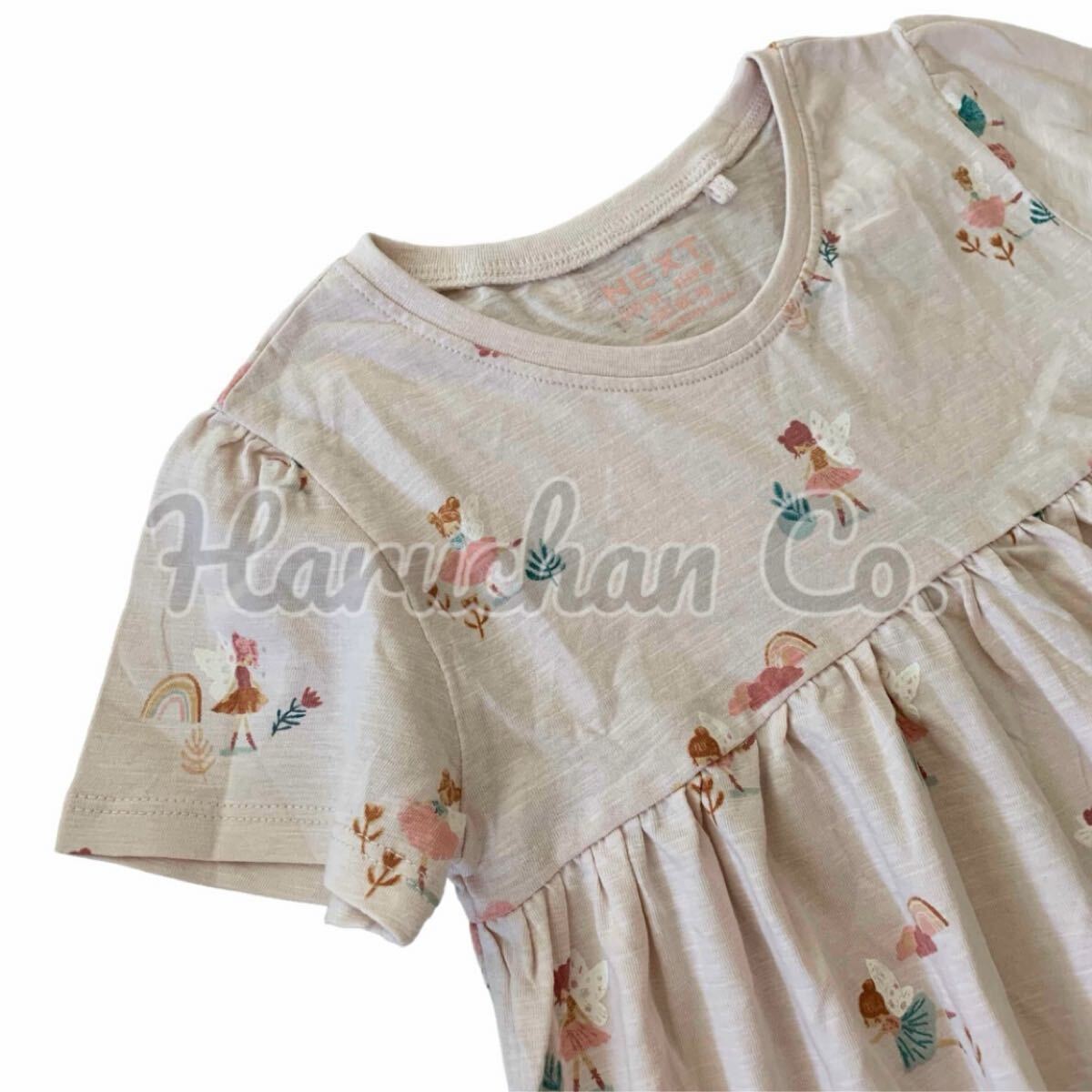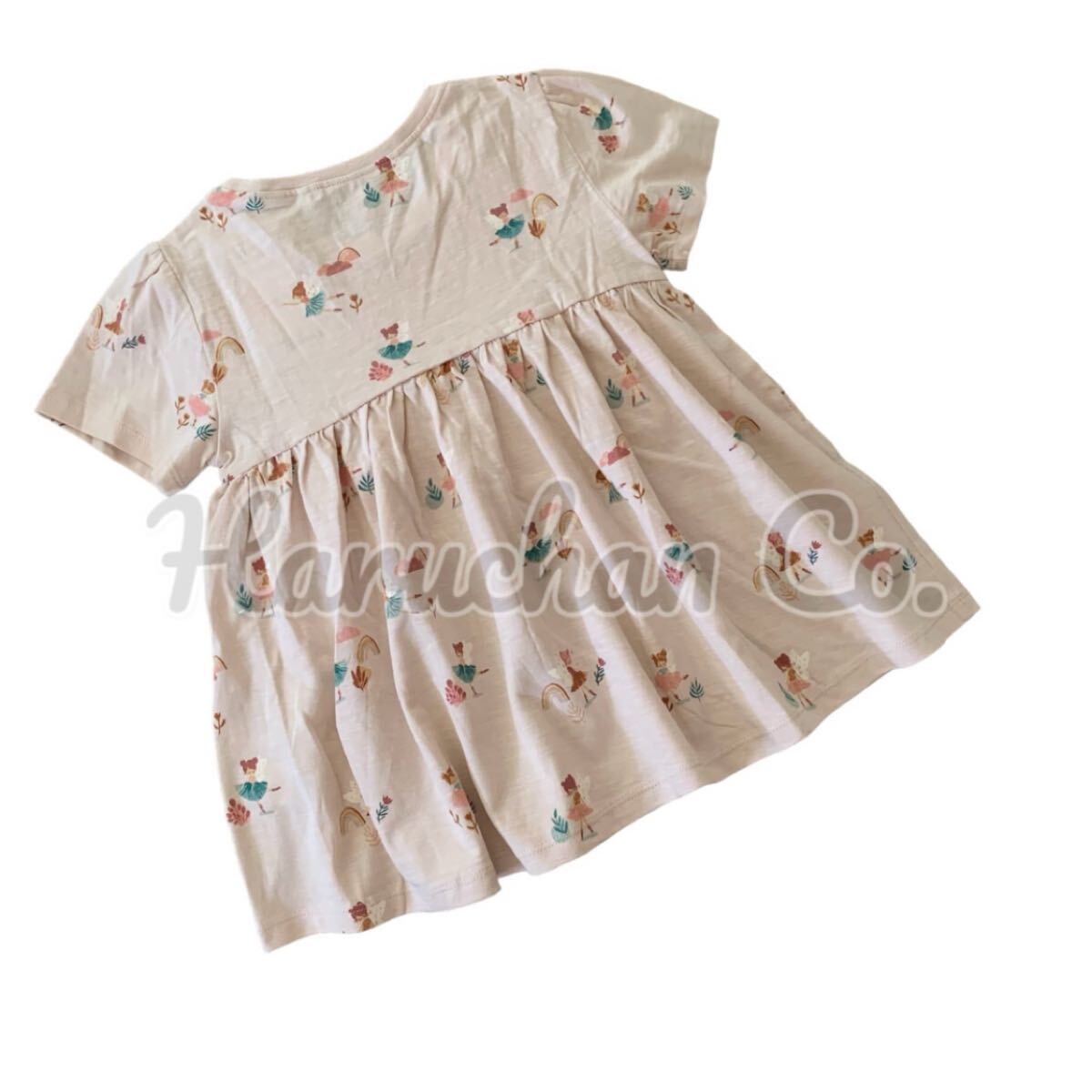 ピンクがかったベージュの様な色味のフェアリー柄のフレアトップス