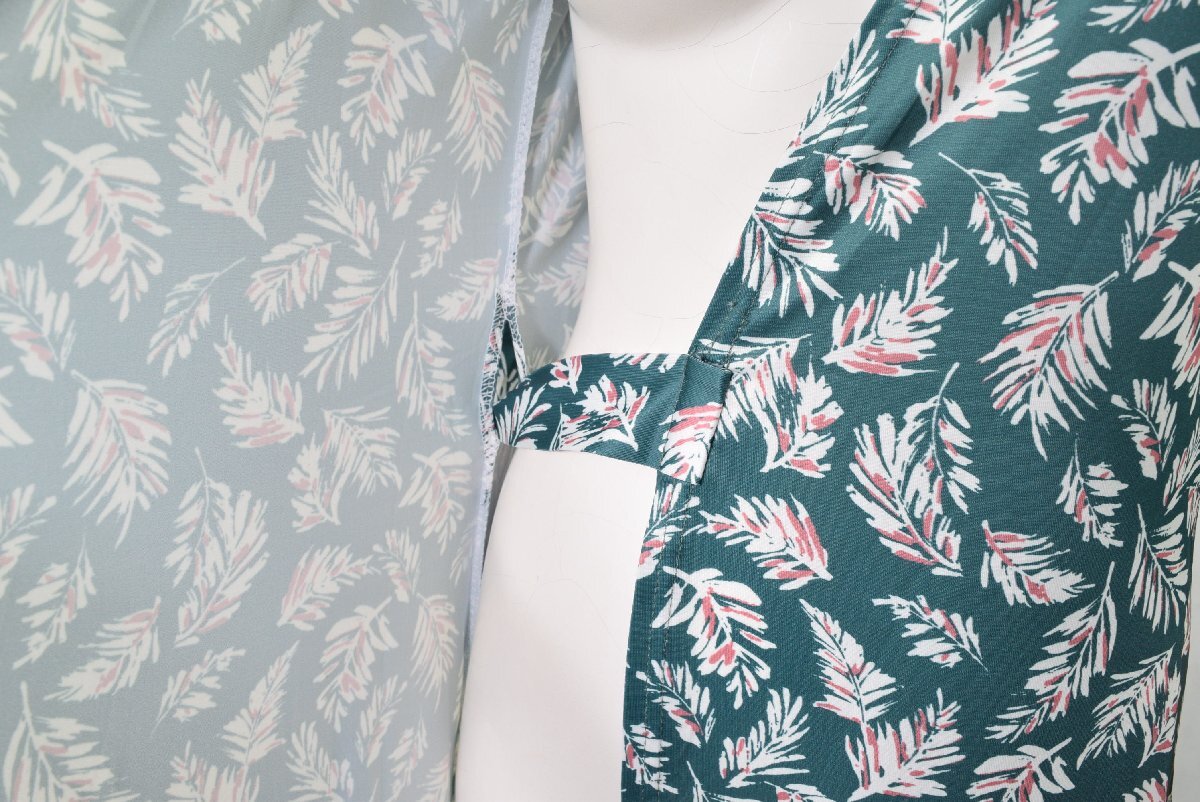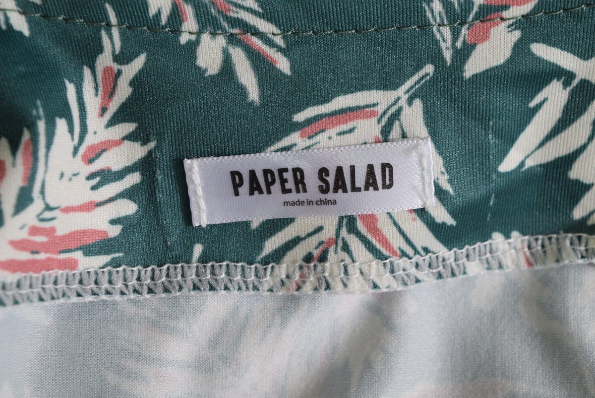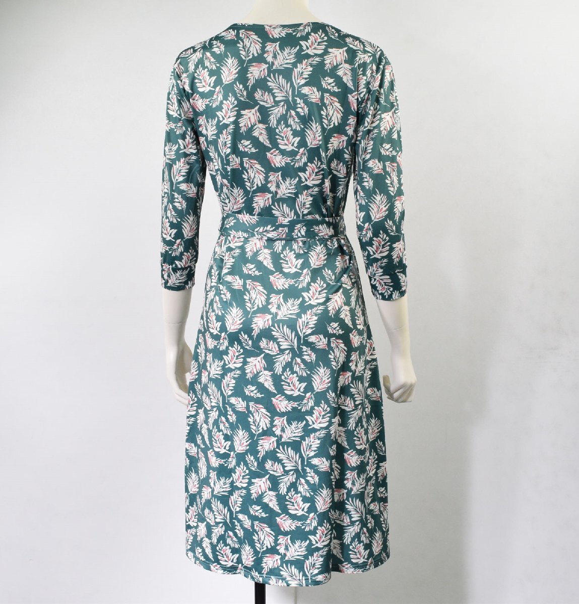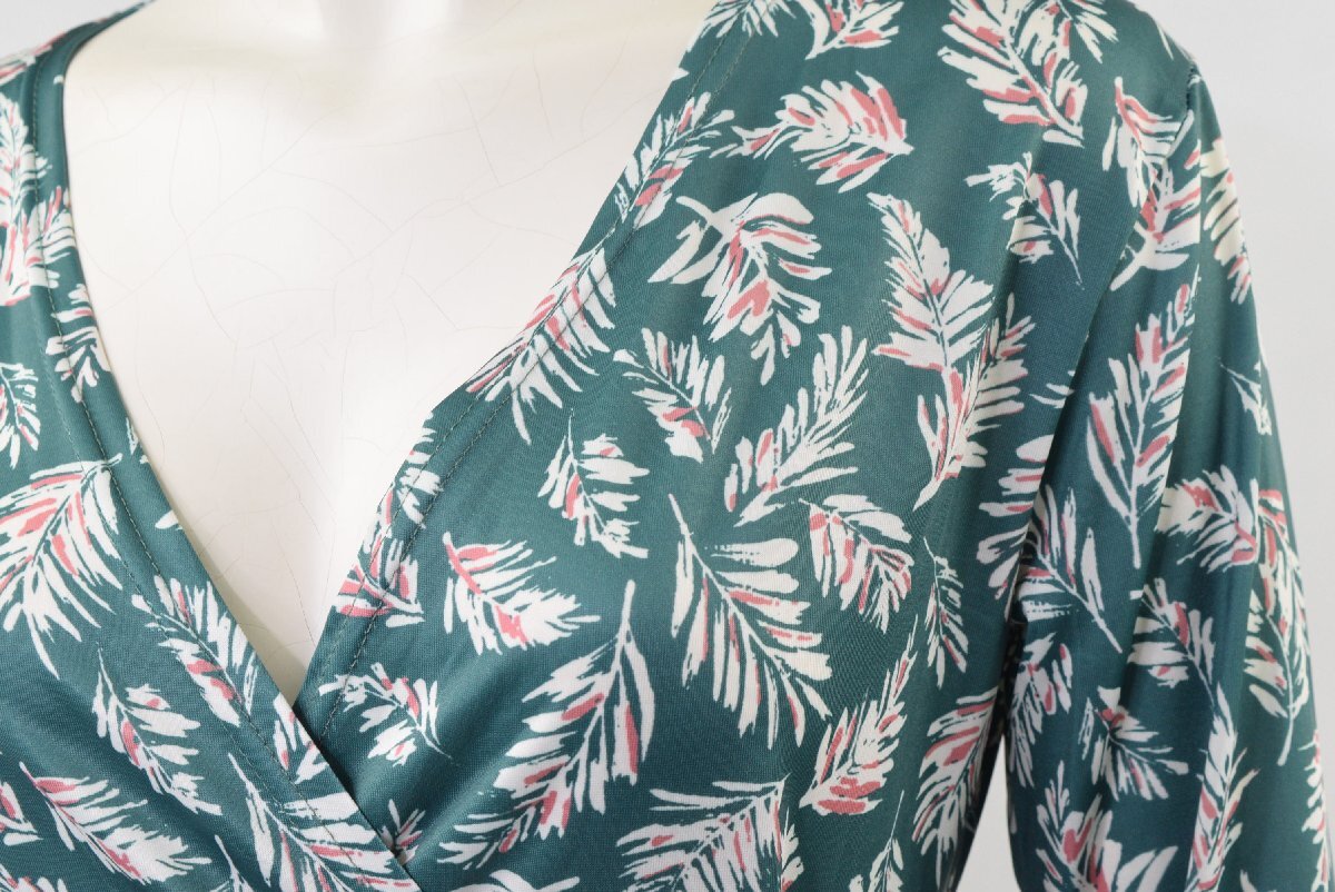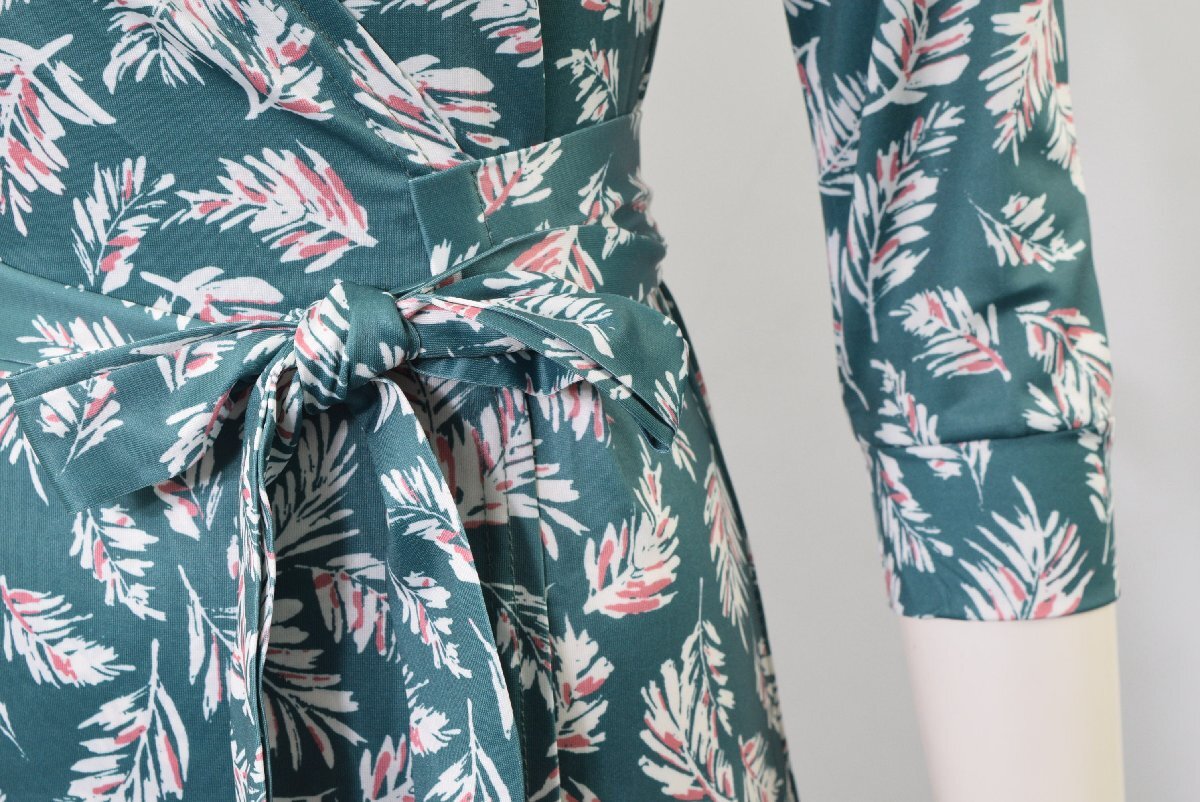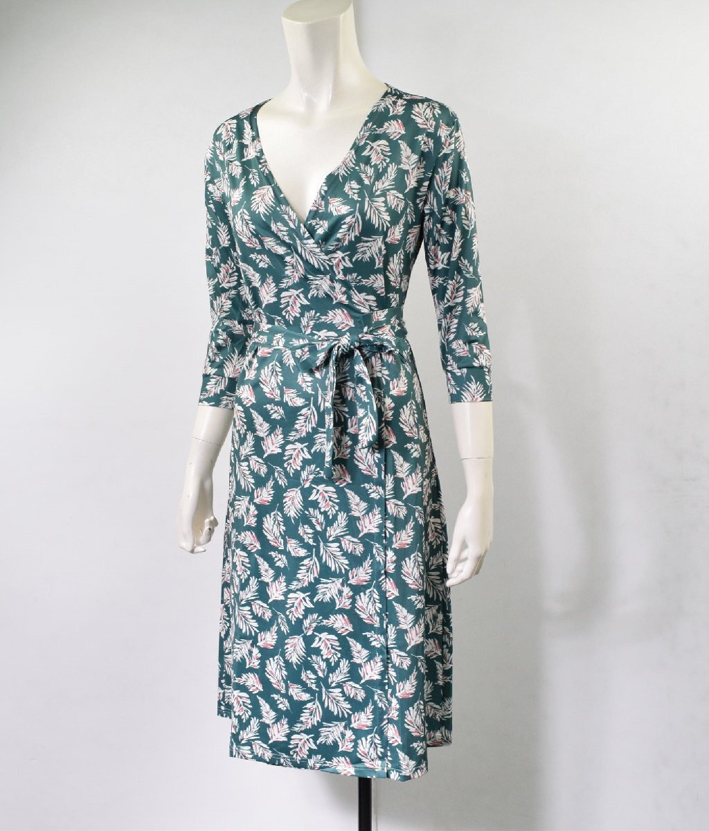 5000-KA00114★PAPER SALAD インポート★春夏 ジャージーラップワンピース S グリーンリーフ柄 カシュクール 七分袖 緑 ボタニカル