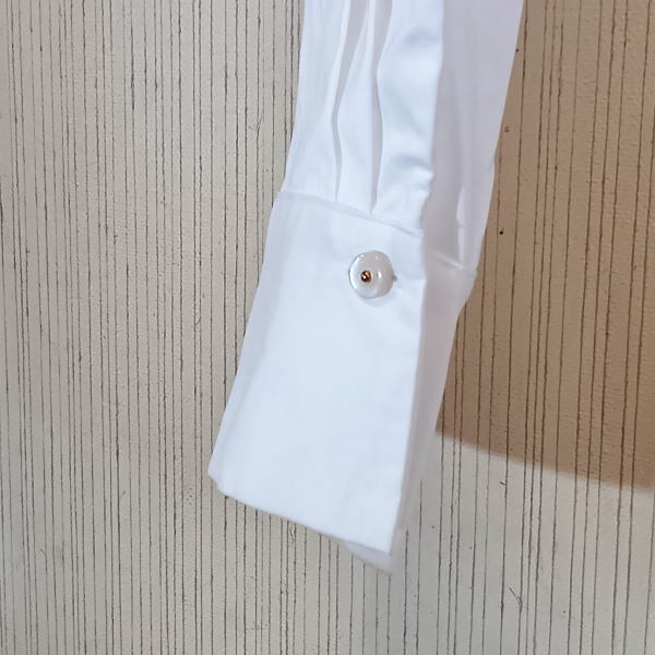 比翼仕立てになっており、ゴールドのアクセントが入った第一ボタンがフォーマルな印象を与えてくれます。フロントウエストや袖にはタックが入っており、バックウエストにはたっぷりとギャザーをあしらうことで、全方面フォルムの美しさが光る一枚♪