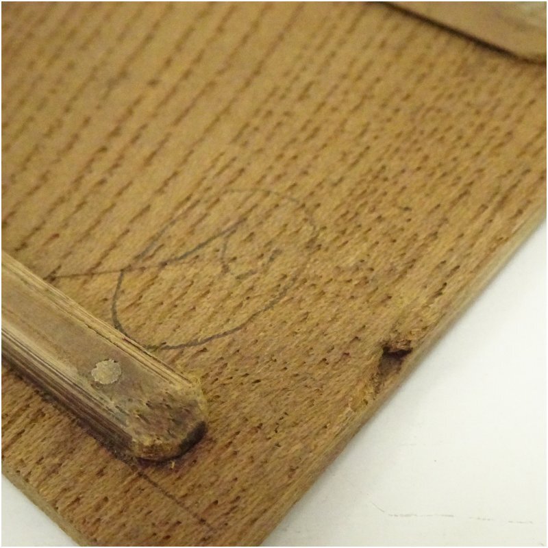 蓋の側面に欠けがあり、蓋裏に書き込みがあります。