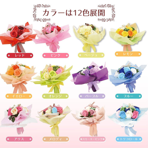 香る、かれない、せっけんのお花 生花やプリザーブドフラワーに代わる「第3のフラワーギフト」です。 ほのかな香りとボリューム感たっぷりで華やか、石けんで出来ているため枯れることなくお手入れ不要です。 ・大人気のカラフルブーケ。 華やかなラッピングで贈り物に喜ばれること間違いなし! ・ドット柄クリアバック入り。 ★シャボンフラワーってどんなもの? ・花びらを石鹸素材でつくっています。 ・ほのかに石鹸アロマが香ります。 ・生花と違い枯れないので長く楽しめます。 ・生花が置けないような場所でも大丈夫! ・プリザーブドフラワーより、かなりお値打ち! ※実際の商品と画像の色合い・パーツなどの配置、イメージ等、異なることがございます。 ※予告なく箱の色、ラッピングの仕様が変わることがあります。 個装サイズ:185X290X185mm 個装重量:約310g 内容量:1個 製造国:中国 【発売元:株式会社ポピー名古屋】 【シャボンフラワー】 観賞用 【サイズ】 全長約26cm、花幅約30cm 【注意事項】 ・手洗いできません。 ・洗顔等できません。 ・お風呂や洗濯で使用できません。 ・石鹸で出来ていますが、洗濯・洗顔を目的とした物ではない為、洗濯・洗顔に使用しないで下さい。 ・食べられません。 ・香りに多少の強弱がある場合があります。 ・素材の性質上ひび割れがある場合があります。 ・太陽光などに長時間あてると色が変色する場合があります。 ・保存の際は高温多湿、特に水のある場所にご注意ください。 ・だんだんと変色(若干の色抜け)はしますが、負荷を掛けない限り花びらが崩れたりする事は稀です。 注意事項 予告なく成分・パッケージが変更になることがございます。 予めご了承ください。 *予告なく成分・パッケージが変更になることがございます。予めご了承ください *ダンボールを使用して発送する場合には、入数以下の個数の場合、 中古ダンボールを使用する場合があり、ご注文の商品とは異なるダンボールになる場合があります。 あらかじめ、ご了承ください。 |