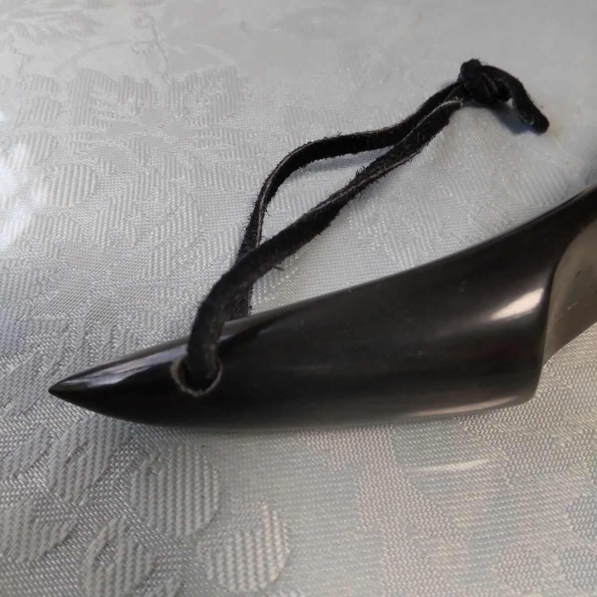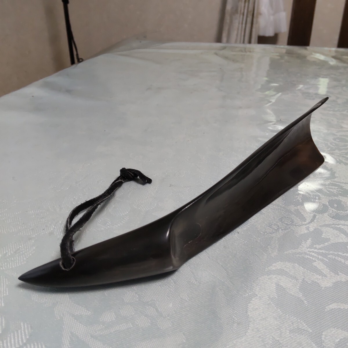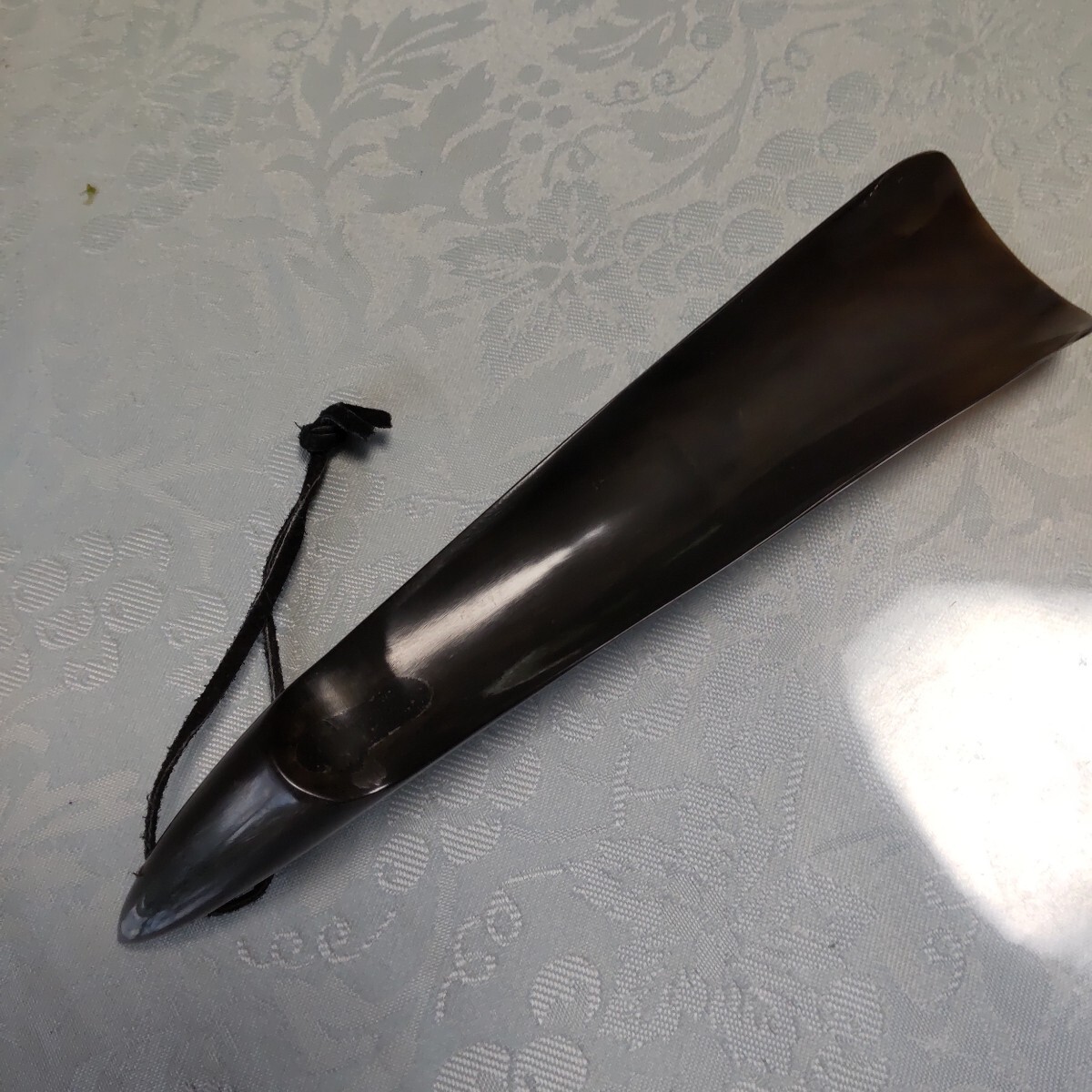 角の先から一本で手造り、天然の角ですから一本ごとに模様や筋目が異なり楽しい靴ベラです。