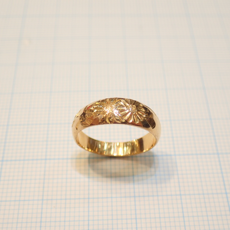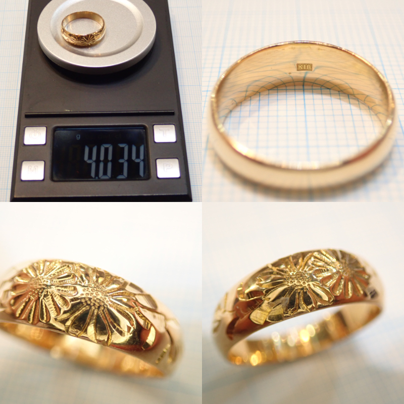 ■K18 月型甲丸リング 和彫 模様彫り■アンティーク 昭和レトロ■月形甲丸 指輪■中古磨き仕上げ■