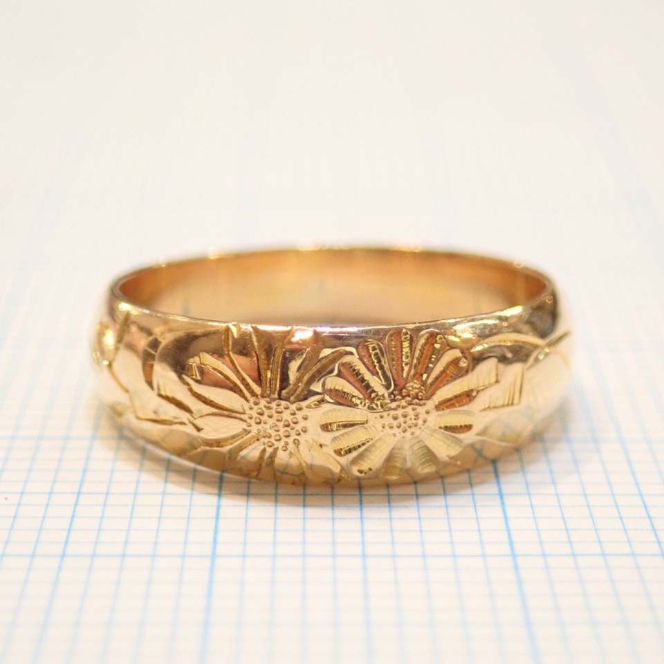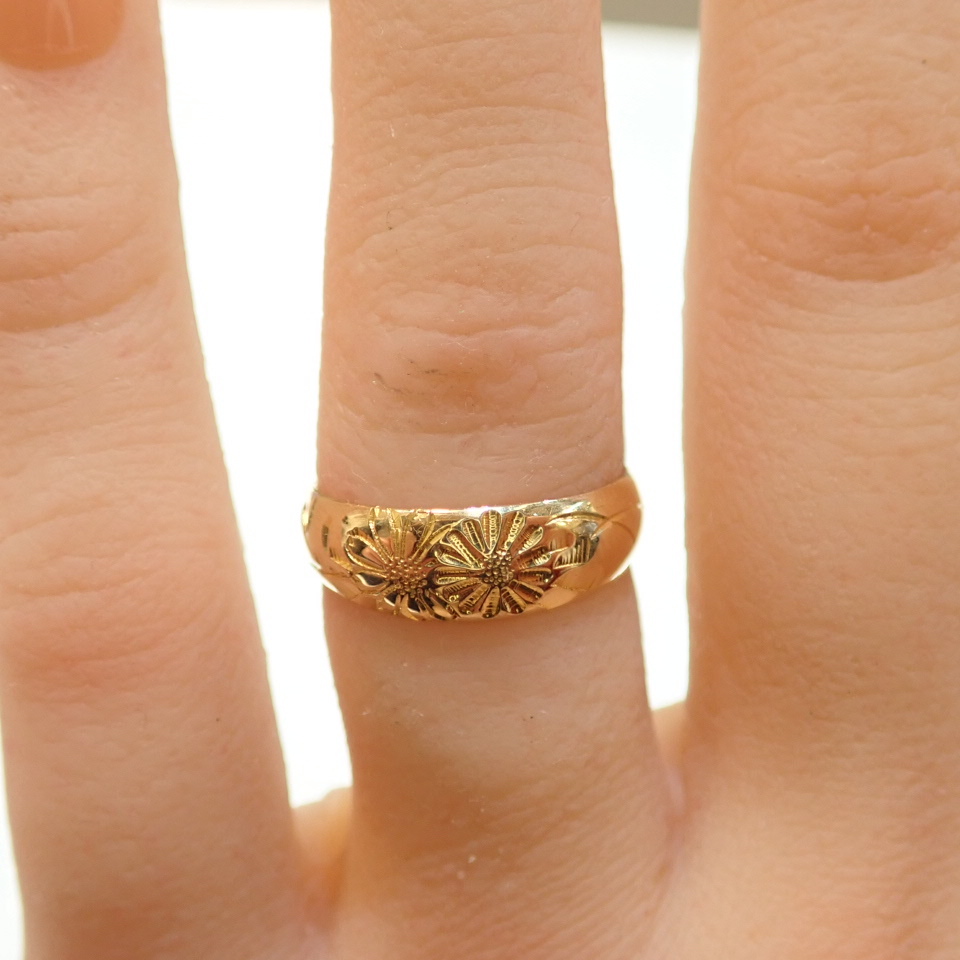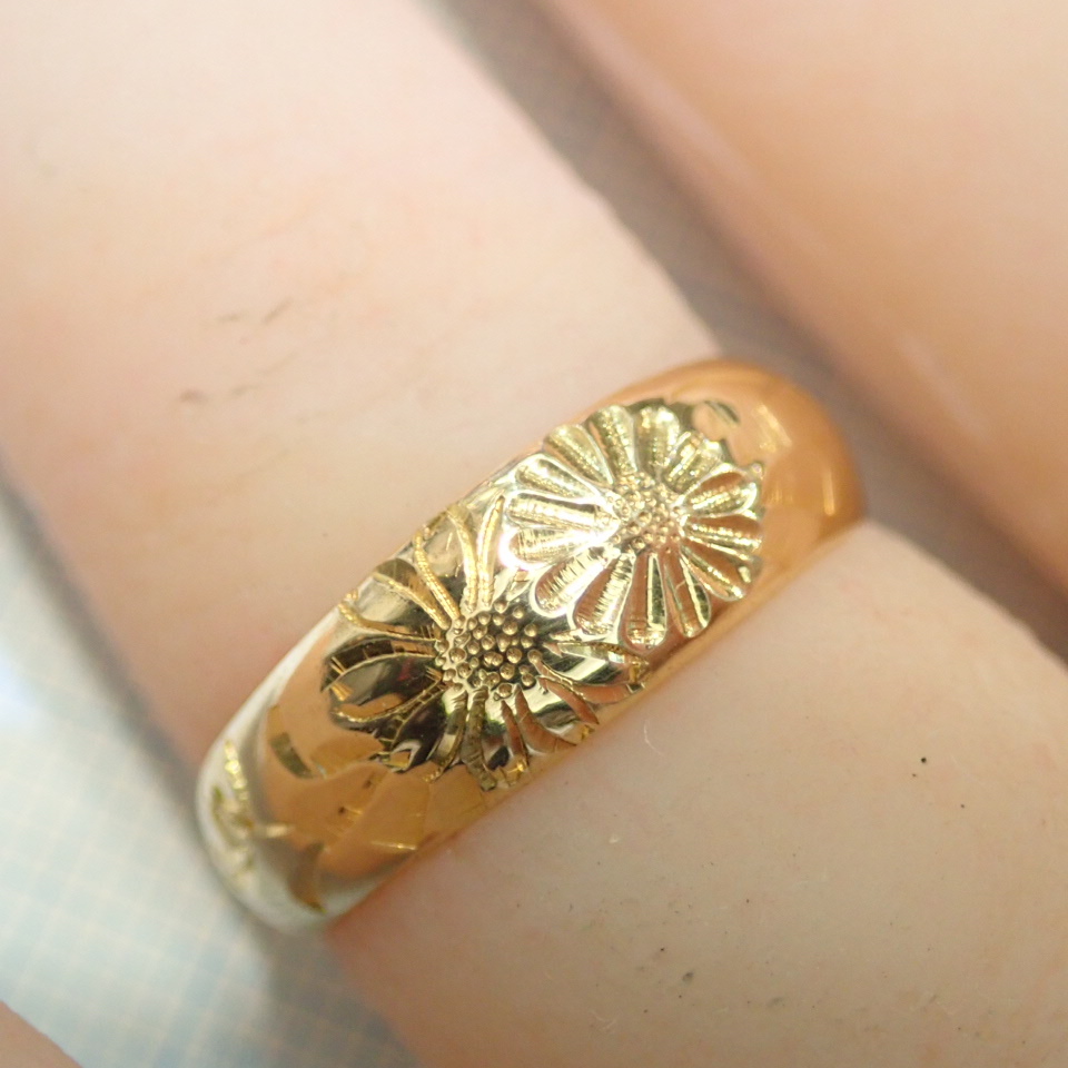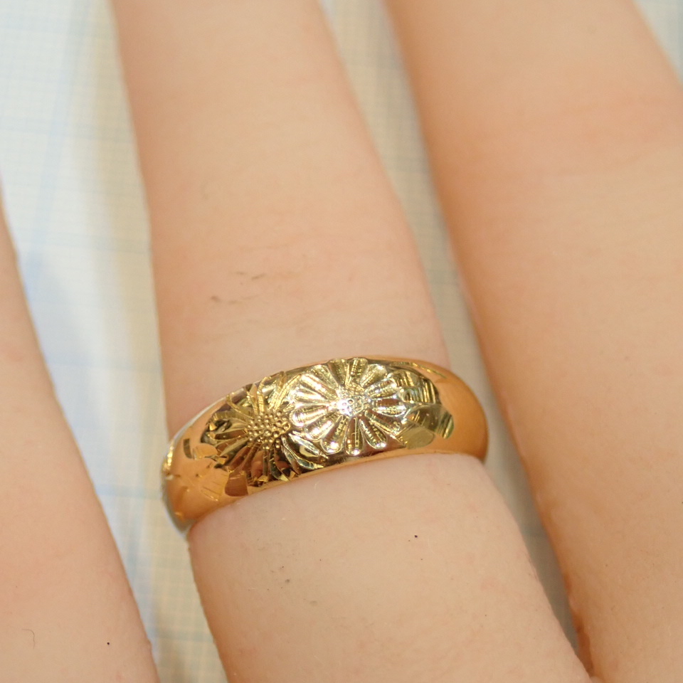 美しい彫り模様が上部分に施されたており、特に花のようなモチーフが連なるデザインは、指元を華やかに彩ります。