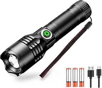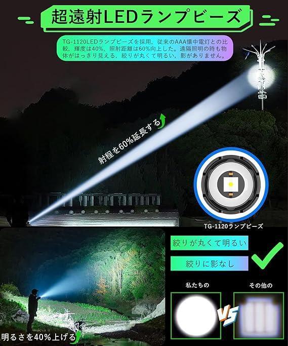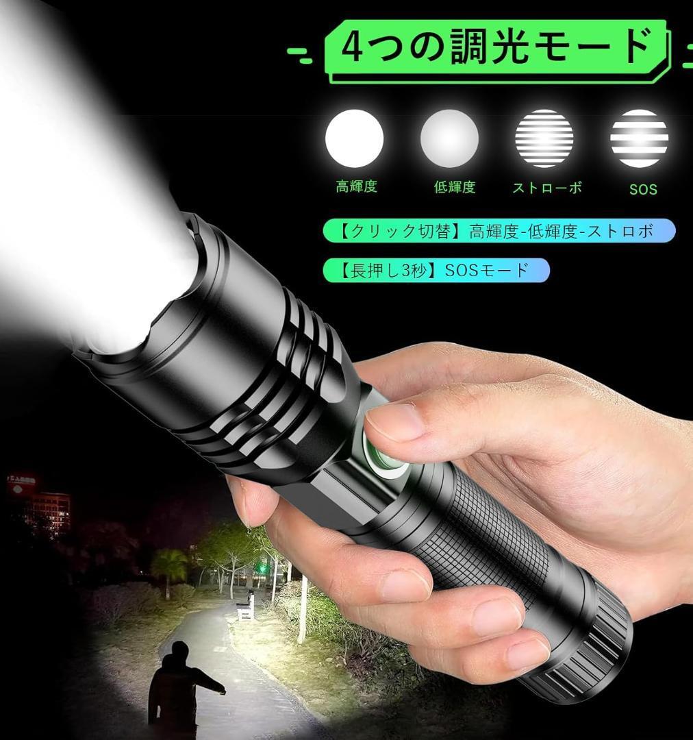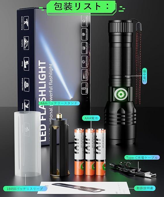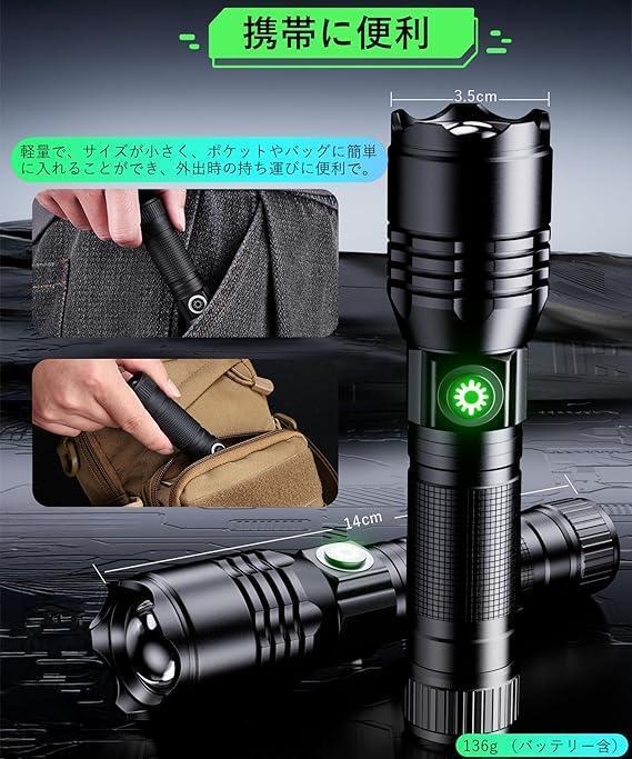 【Type-C 3.0 USB急速充電+長時間航続】懐中電灯は優れた充電効率を持つUSB Type-C 3.0ポートを採用し、多種の充電設備と互換性があり、充電速度は通常のusbより30%向上し、急速に電力を満たすことができ、充電時間を節約した。大容量単4電池を付属する。長時間の航続が可能です(SOSモード)。(注意:単4電池は充電不可)。電源インジケータを装備しており、充電中は赤色のインジケータが点灯し、充電が完了すると緑インジケータが点灯します。 充電時間は約3〜6時間です。 使用中は、インジケータランプが完全に充電されると緑色になり、電力は100%〜20%の事を示します。インジケータランプが赤色になると電量が20%未満です。